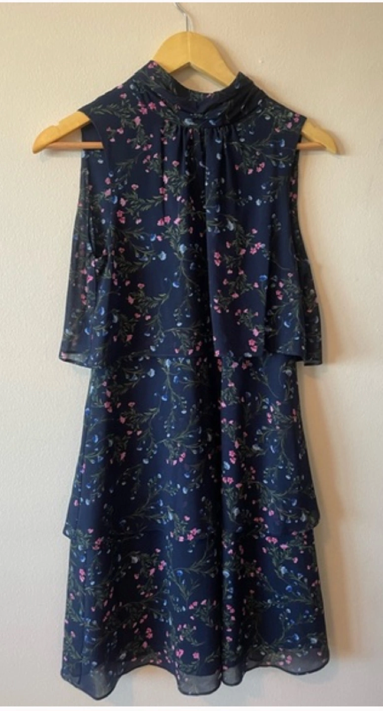 Sleeveless dress with a mock neck, a navy blue background, and pink and blue flowers. The dress has a tiered skirt and a flowy silhouette. It is comfy and cute. Wear it in fall or spring with a jacket/cardigan.