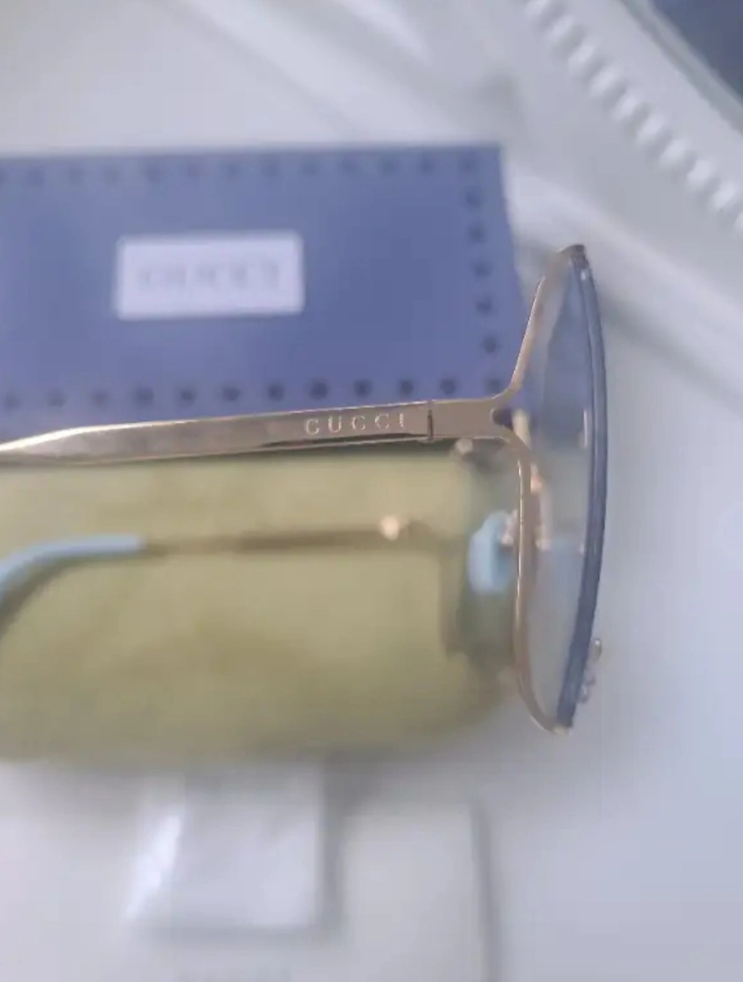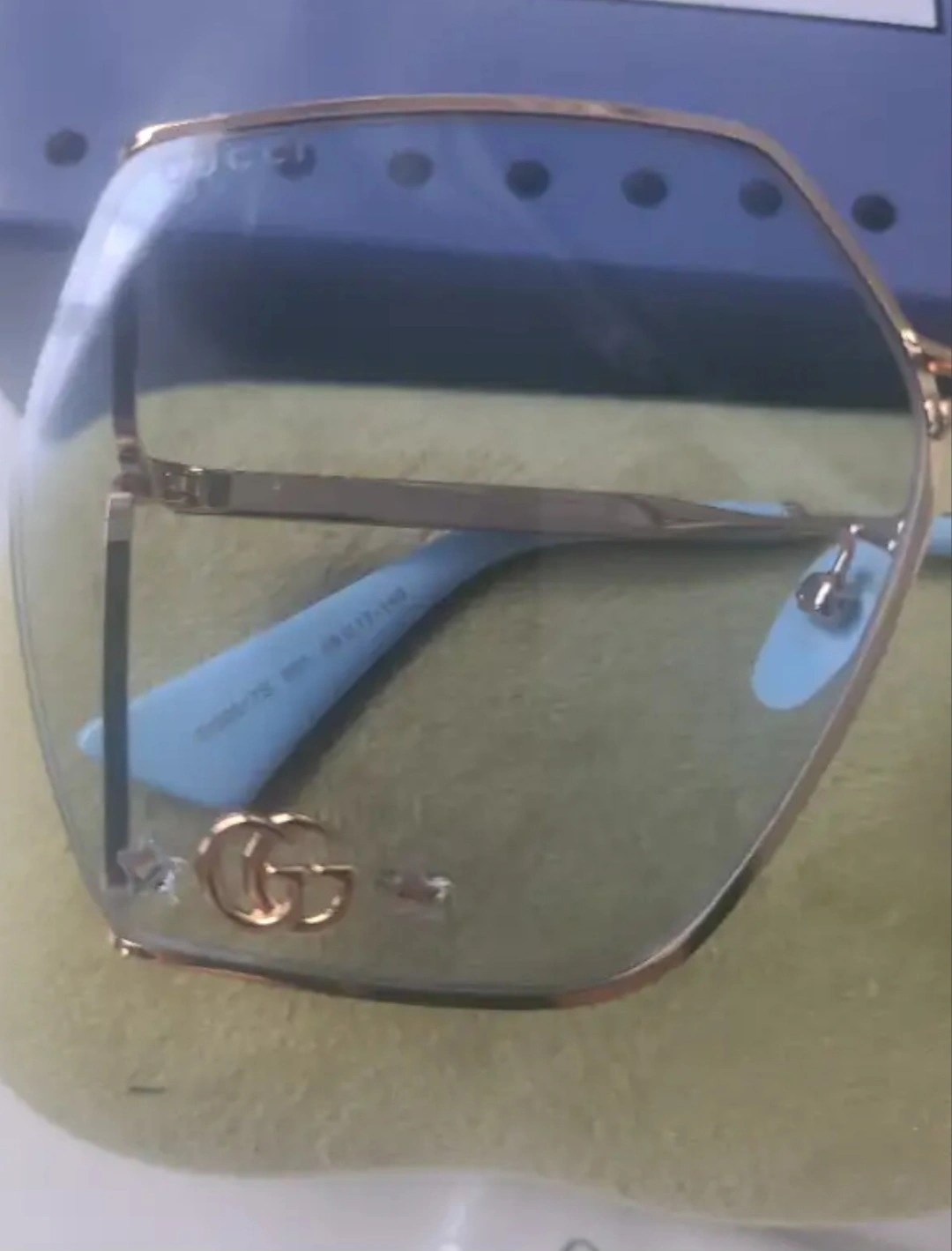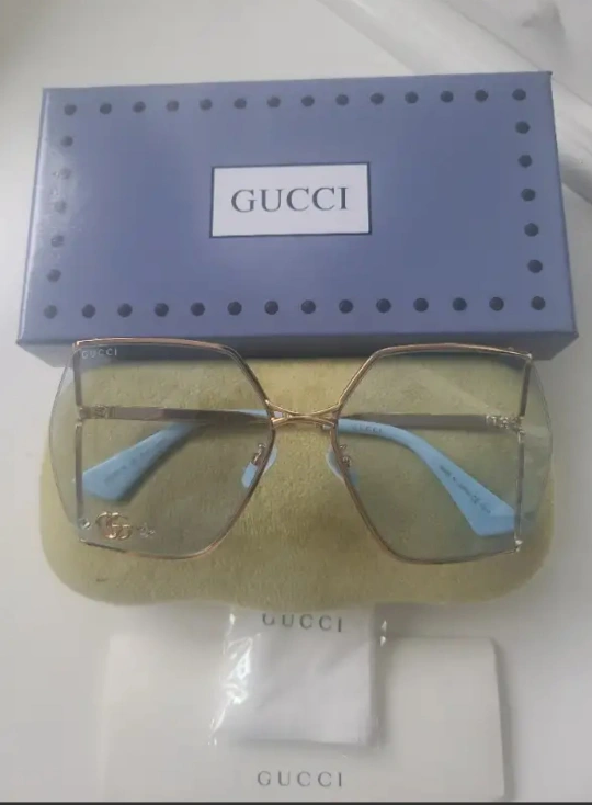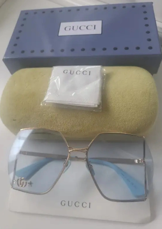 Christmas season is here!!! Gold-rimmed sunglasses with blue lenses and GG embellishment on lense. Comes with case, cleaning cloth, and box. Perfect for every occasion.