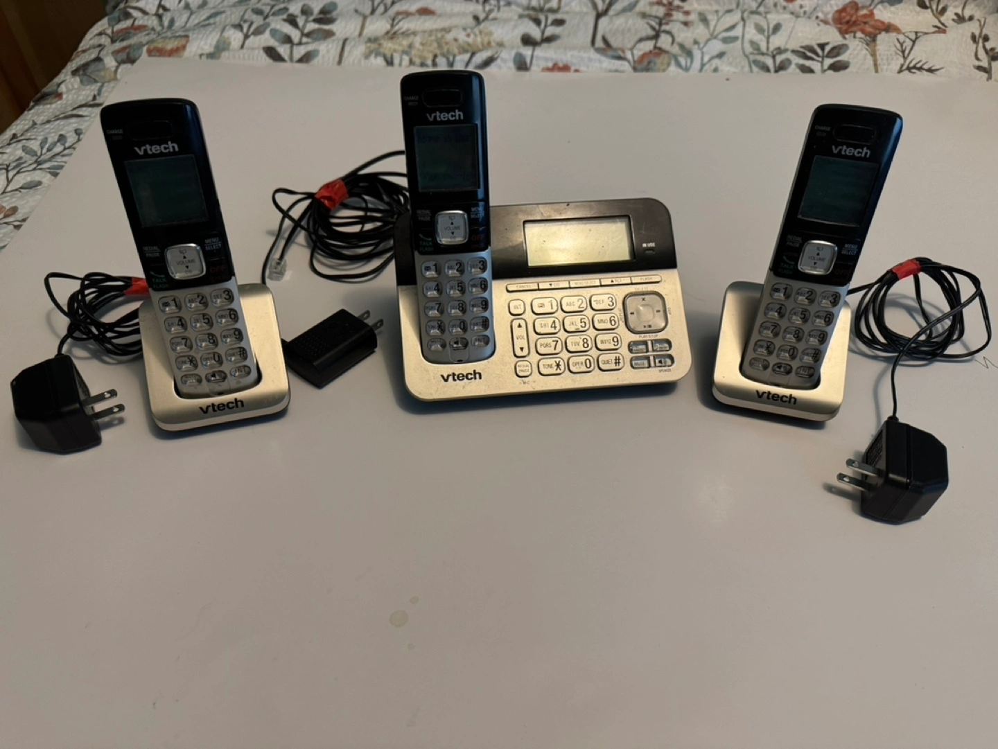 96Cordless phone with 3 handsets, base unit, and 3 power adapters.