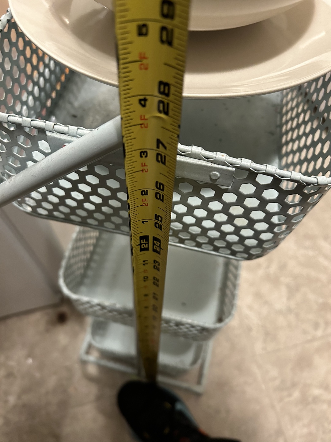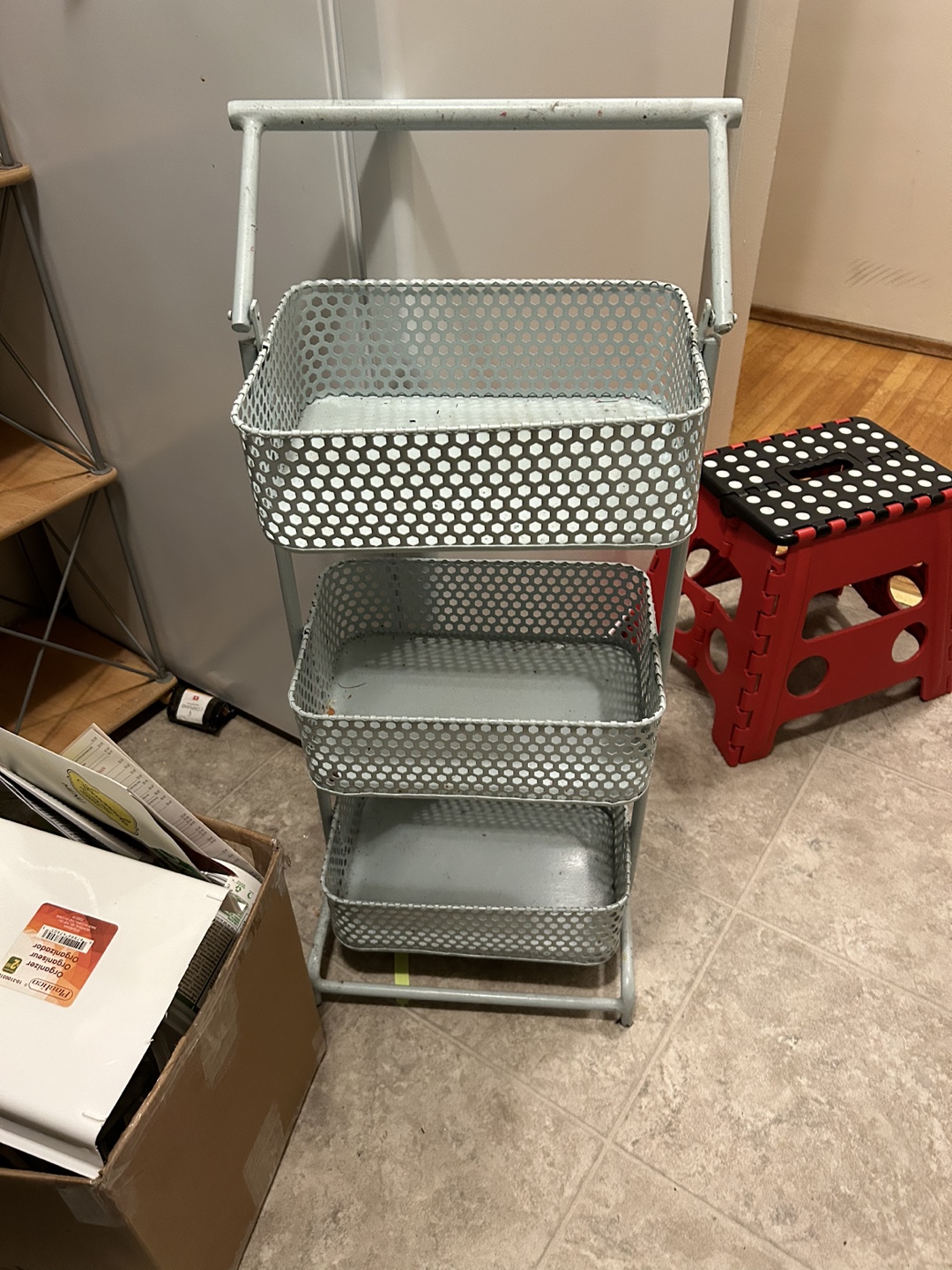 Metal storage shelf with three tiers. Mint blueish colour. Needs a clean but other than that it’s great!