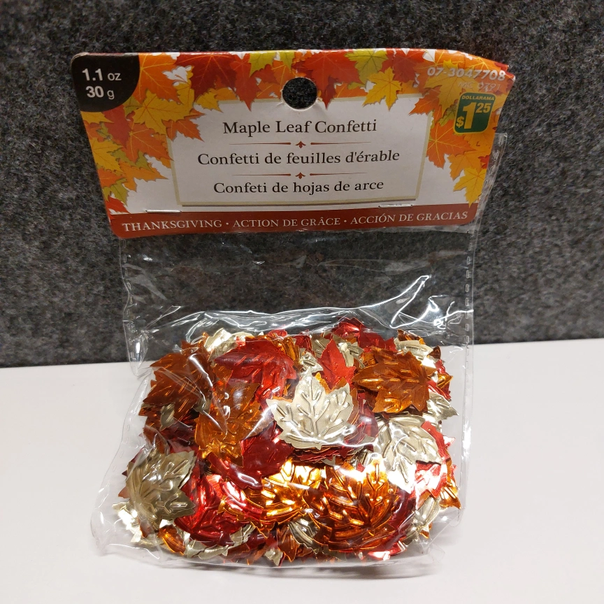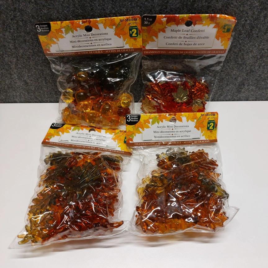 2 packs of mini acrylic leaves (maple, oak) + 1 pack of acrylic acorns + 1 pack of maple leaf sequins, in assorted fall colours and unopened. Originally retails for $7.25 + tax from Dollarama.