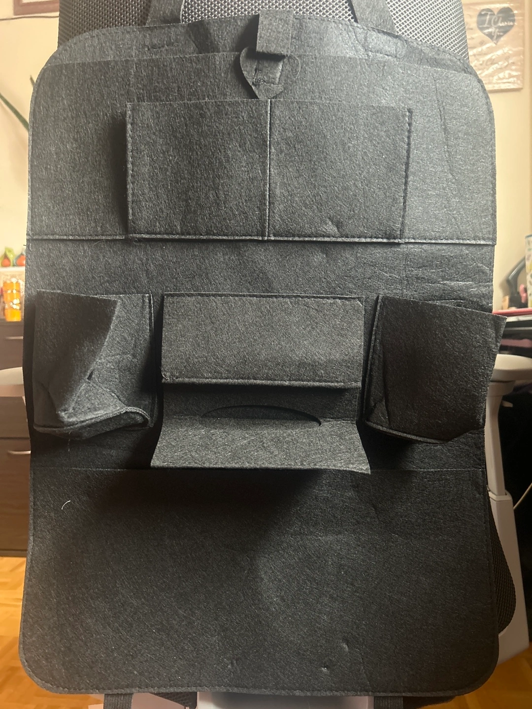 Black felt car seat back organizer with multiple pockets. Great for storing phones, tissues, snacks, and other small items.