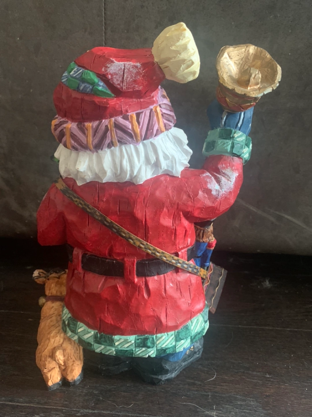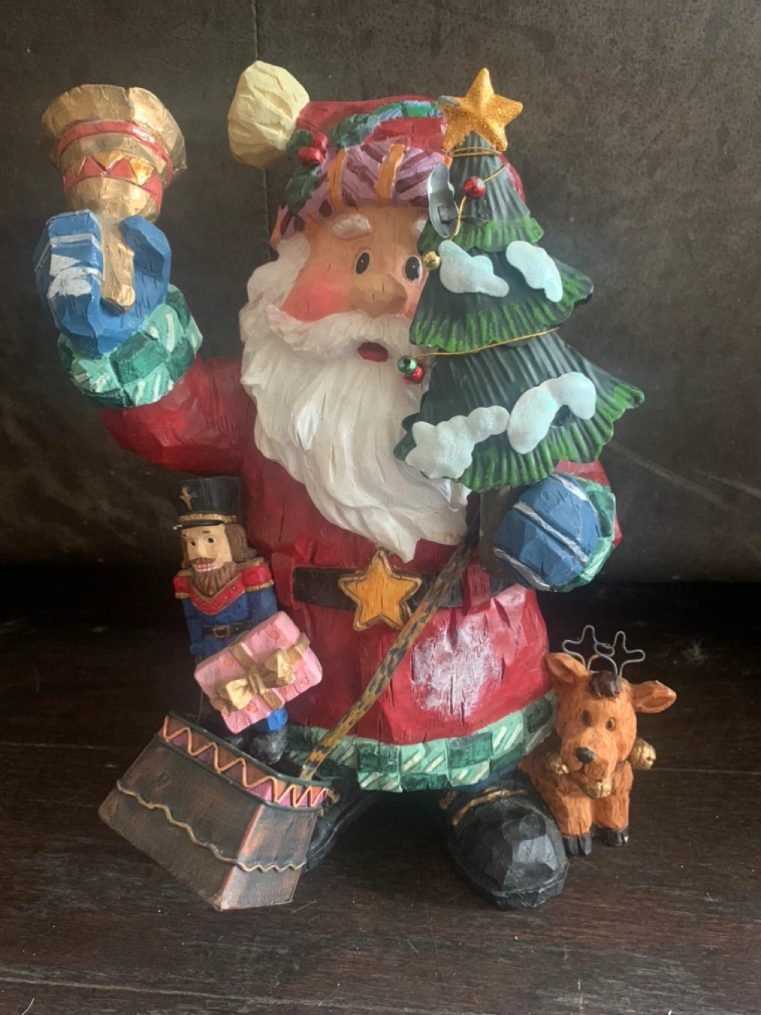 Santa figurine with a Christmas tree, a nutcracker, and a reindeer., and a sac of toys as well as ringing a bell in his hand. The figurine has a rustic, carved wood look. Measure about 12 inches tall and 8 inches wide.