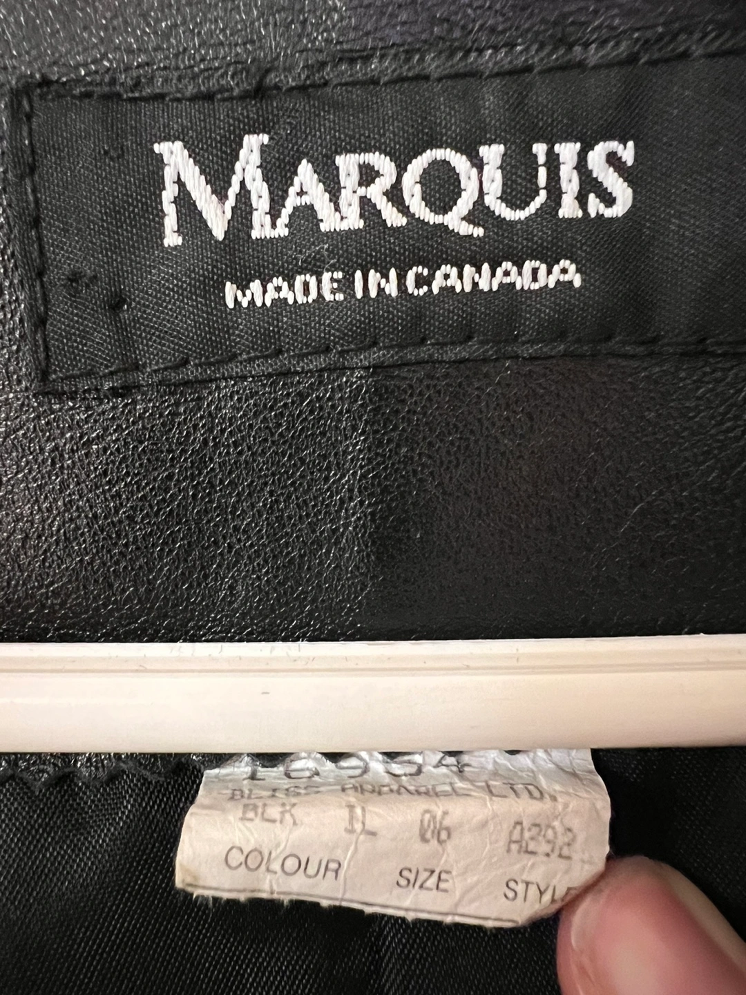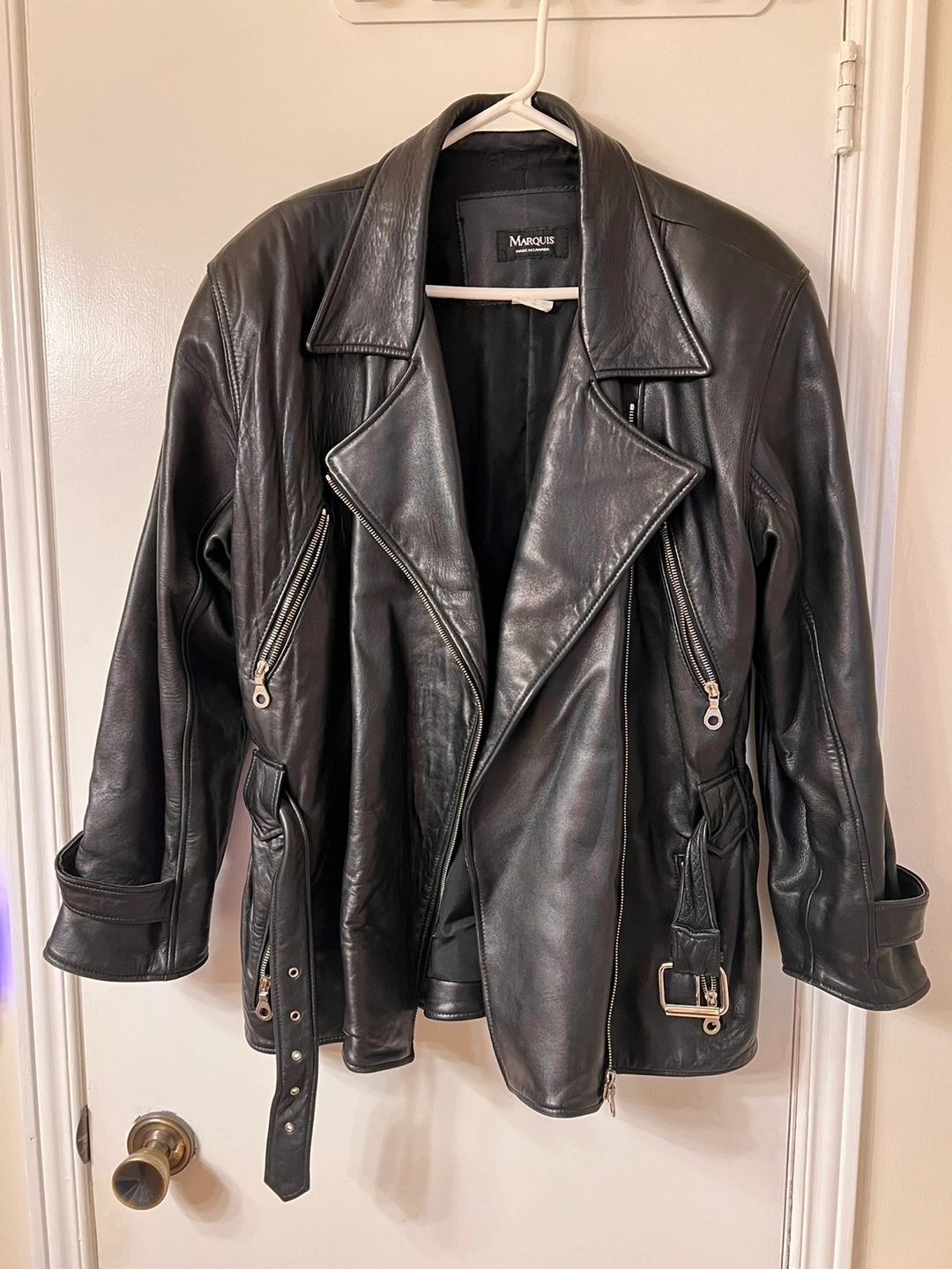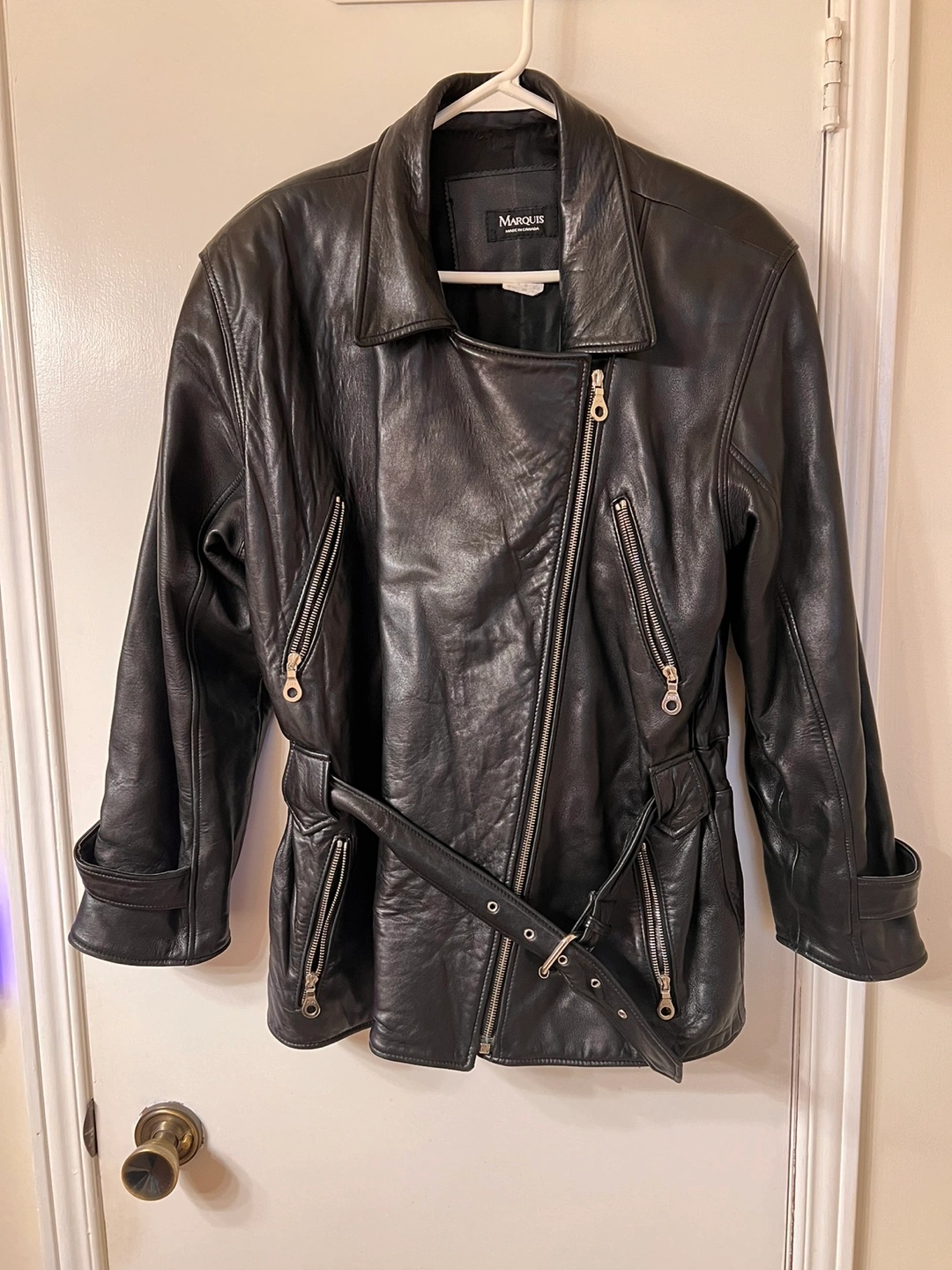 41Vintage/Retro Black leather jacket with a belt. Shoulder pads. Multiple zippered pockets. Made in Canada. Silver accents. 100% leather. Pick up Duffer and Clark