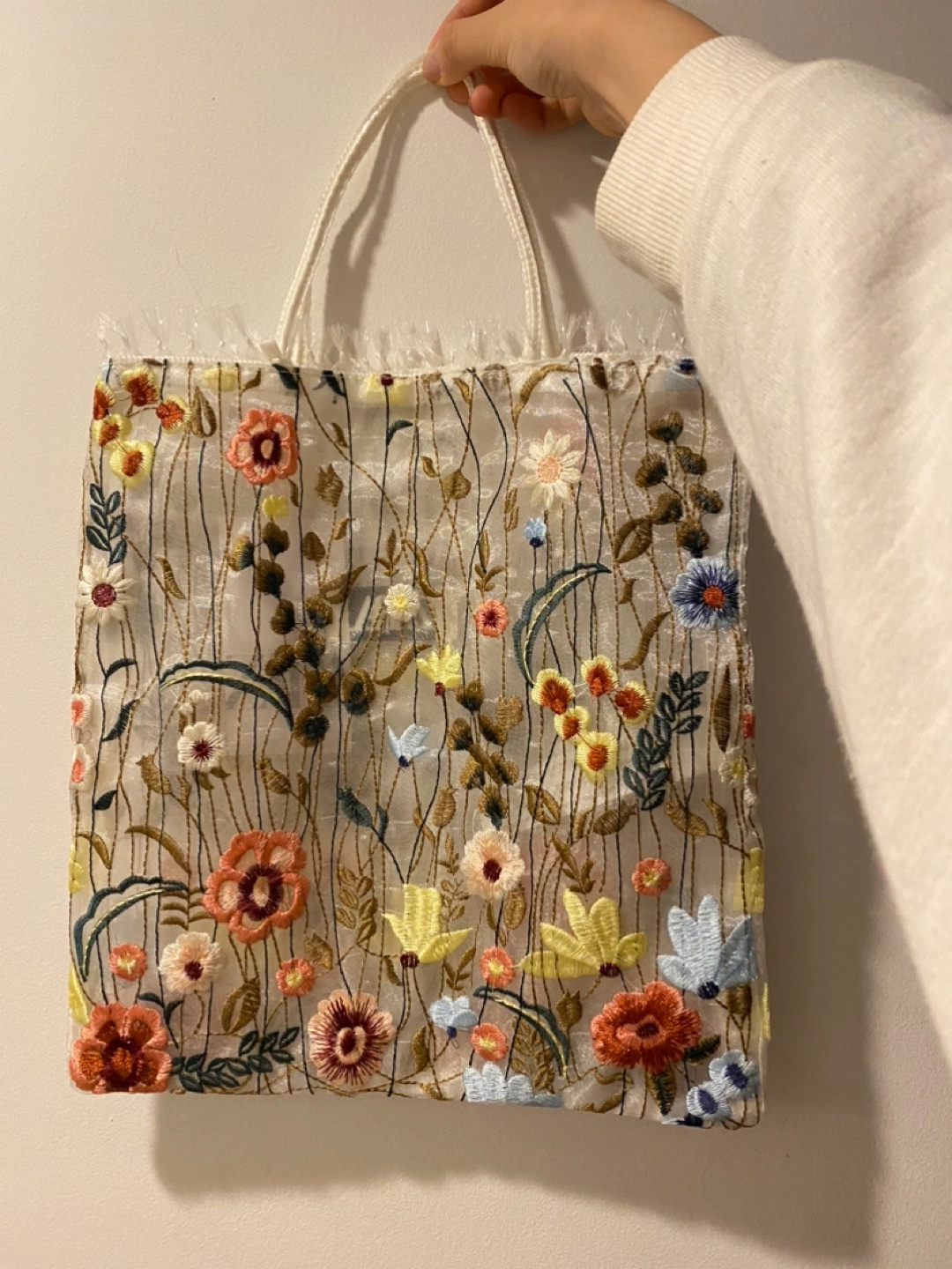 Brand new super pretty floral embroidered fabric tote bag with frayed edges. Has a single top handle.