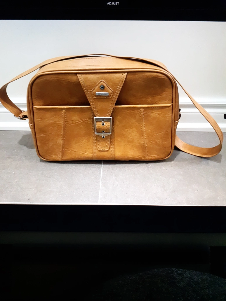 Vintage tan faux leather carry on shoulder travel bag with a buckle closure.