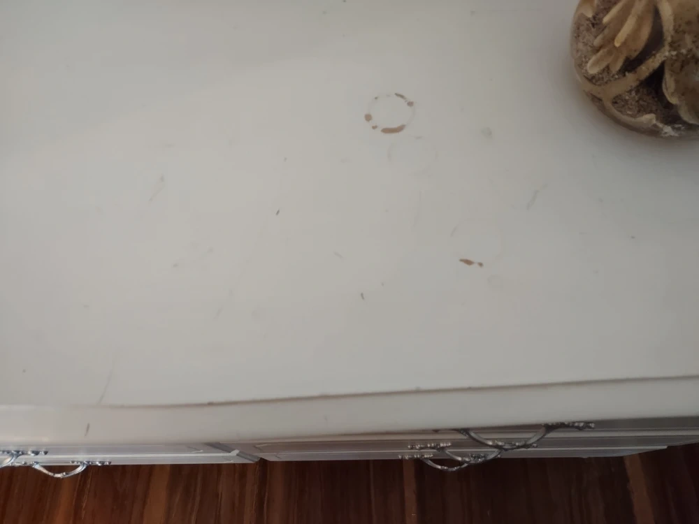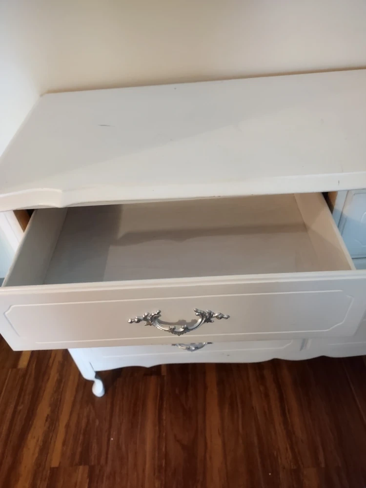 Six-drawer vintage dresser with ornate silver handles. White painted finish. Some minor imperfections (please refer to photos) on the top surface. Very clean, smoke free and pet free home.