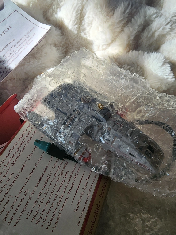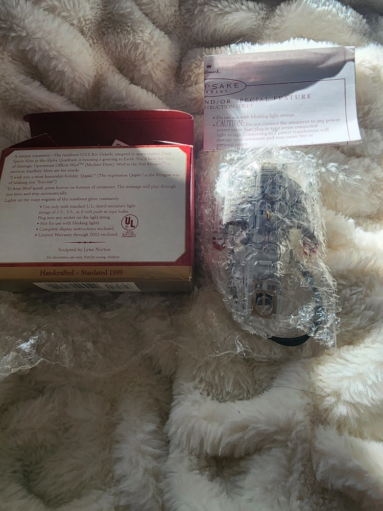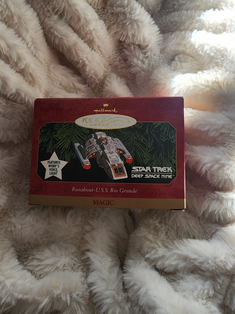 Hallmark Keepsake Ornament featuring the U.S.S. Rio Grande Runabout from Star Trek Deep Space Nine. Lights up with a working Worf's voice sound. Handcrafted, dated 1999.