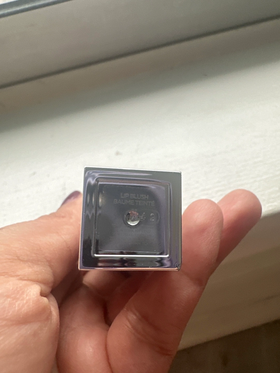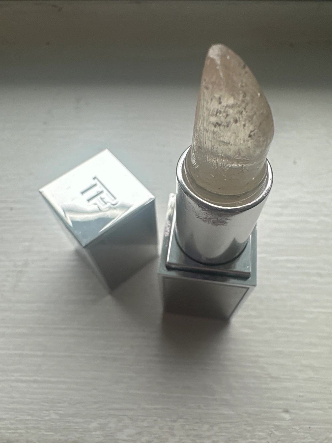 PH adjusting lip balm, clear formula bullet with beautifully suspended glitter throughout that does not transfer on the lips Heavy sliver case. V lux packaging. Getting rid of it because the cool pink it turns my lips is not flattering for my skin tone. Bullet had been cleaned with alcohol.