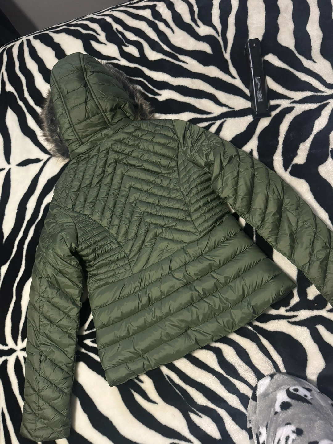 Green puffer jacket with a hood and fur trim. It has a zipper closure and two zippered pockets. The jacket is quilted and has a fitted silhouette. The lining is a soft faux fur.