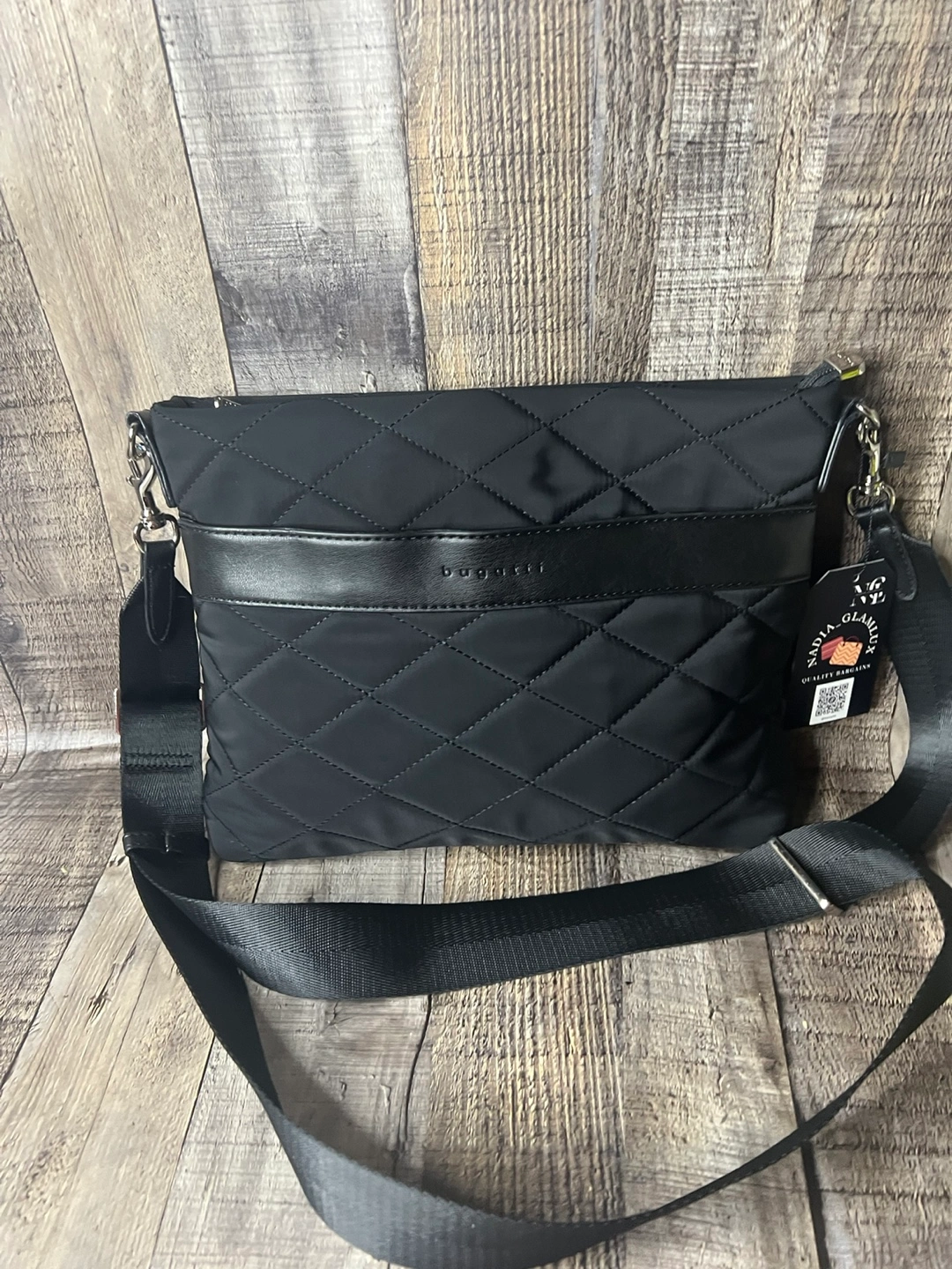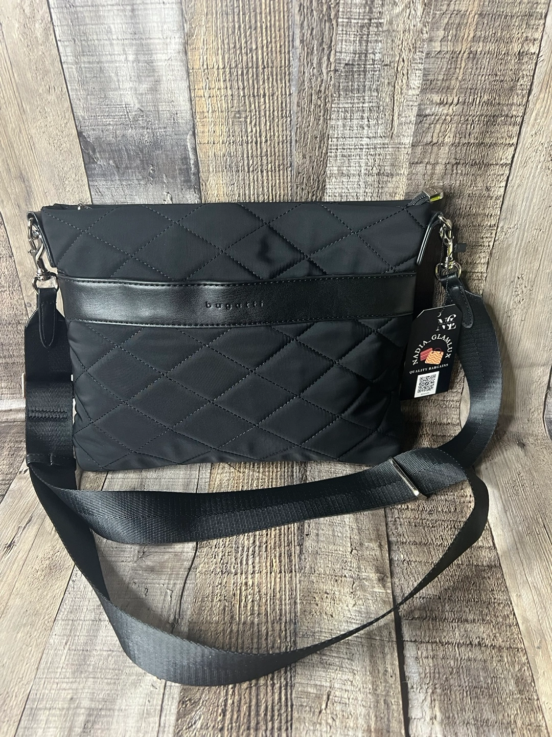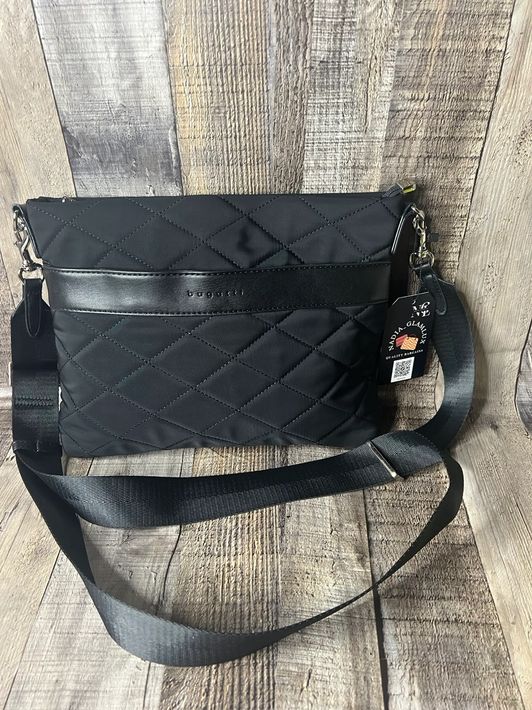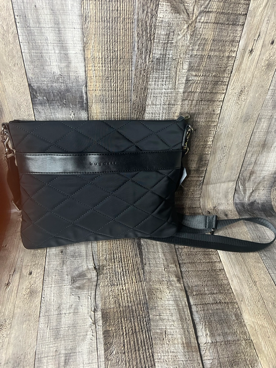 Bugatti Black quilted crossbody bag with adjustable strap and leather accents.