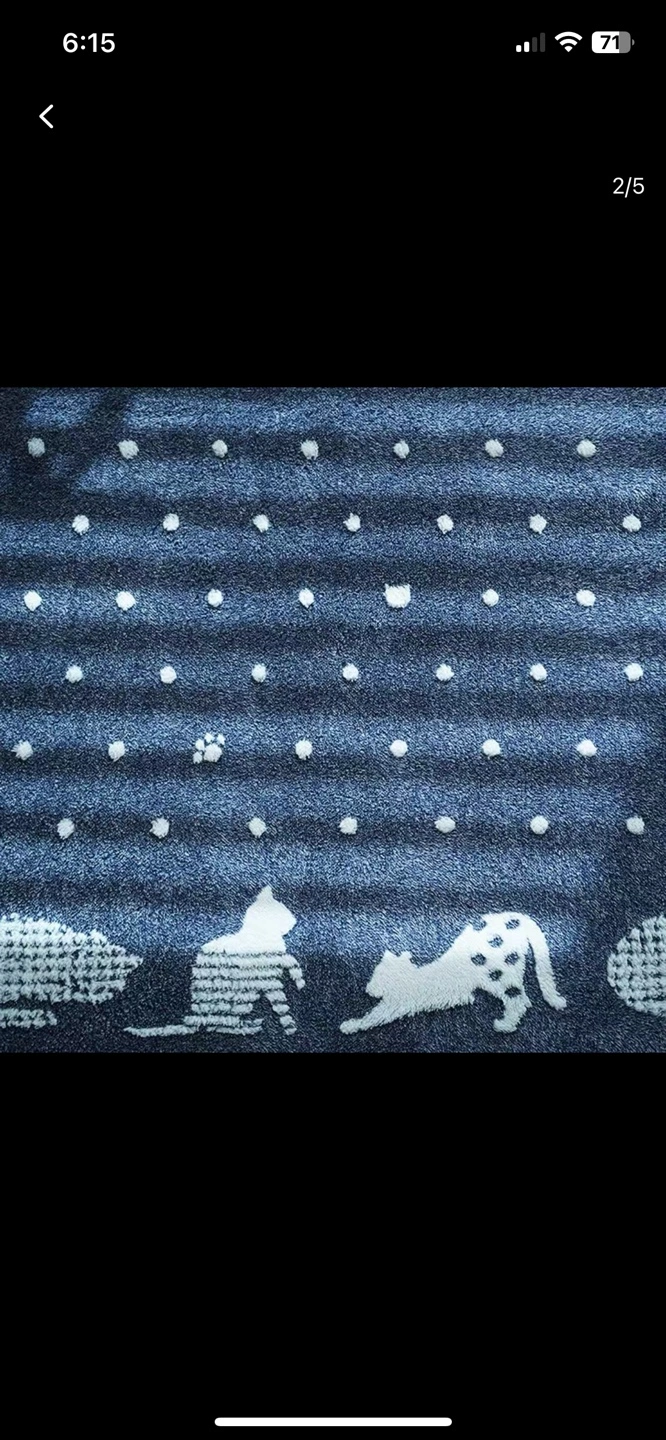 893Blue rug with white polka dots and cat silhouettes. Only use once,doesn’t fit my room. :( Dry clean or gently hand wash. For daily care, vacuum regularly. For stains, use a damp cloth with a mild detergent to clean. Soft with 100% polyster Pick up only Cash only