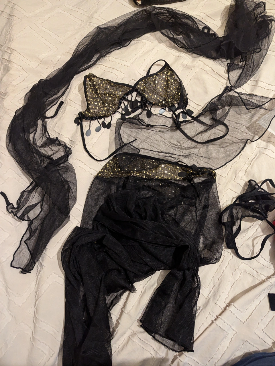 Black and gold belly dancing costume with sequined bra, pants, and two veils. complete set of 5 pieces. no bag