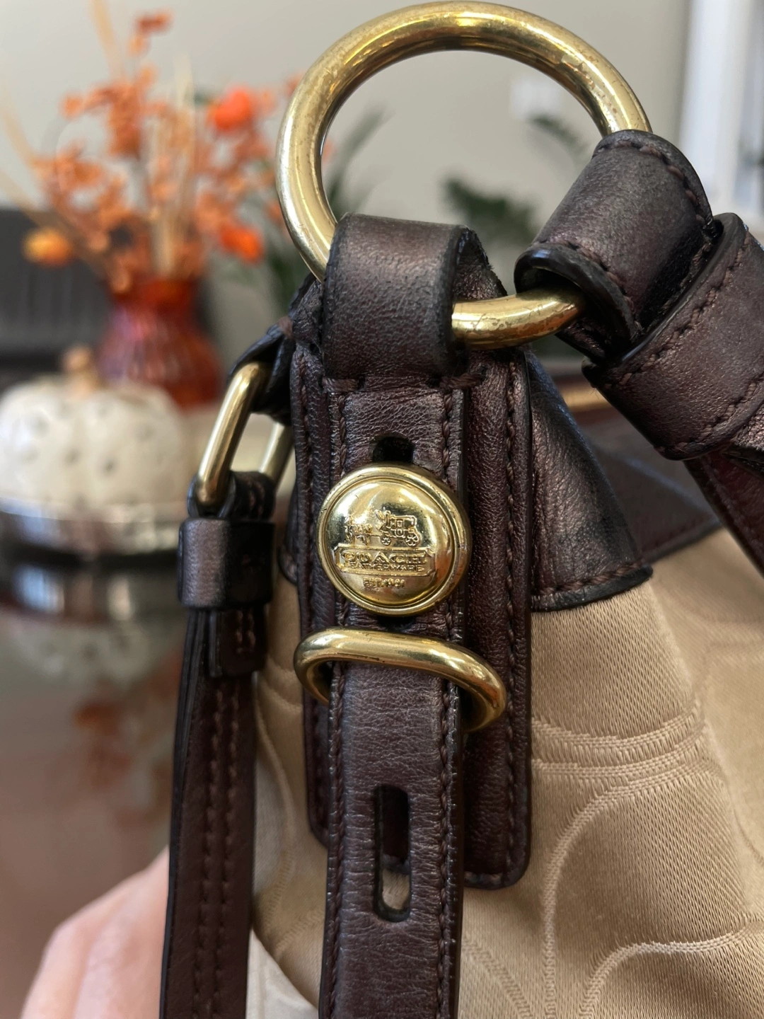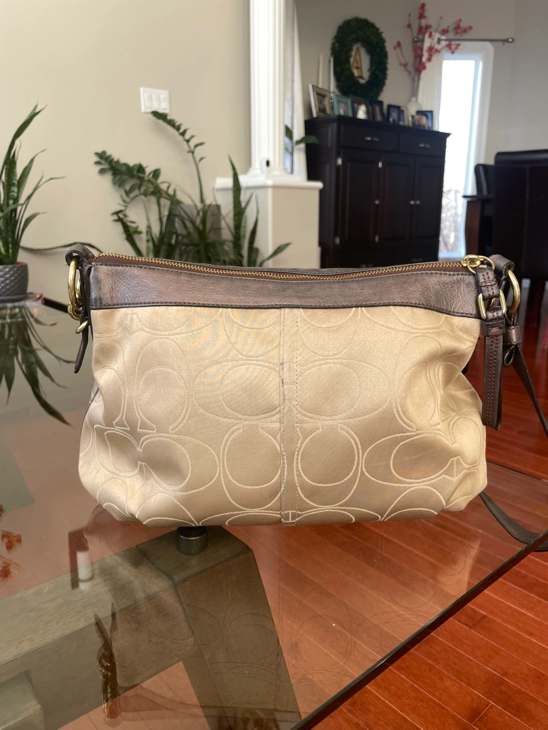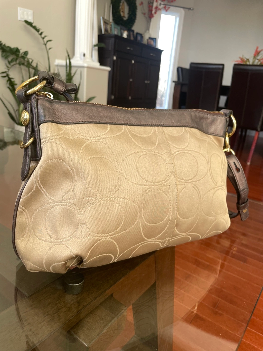 Authentic Coach Mia signature C bag in gold/bronze. In great pre-owned condition - typical for age. Measures 13" x 9" x 4". Zipper top closure. Interior satin lining. Interior zipper pocket with leather pull. Interior authentic tag with embossed No. D1049-15750