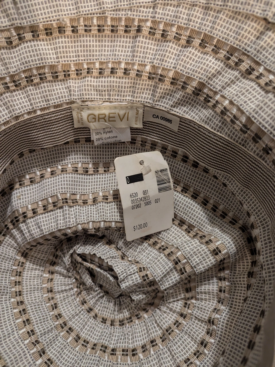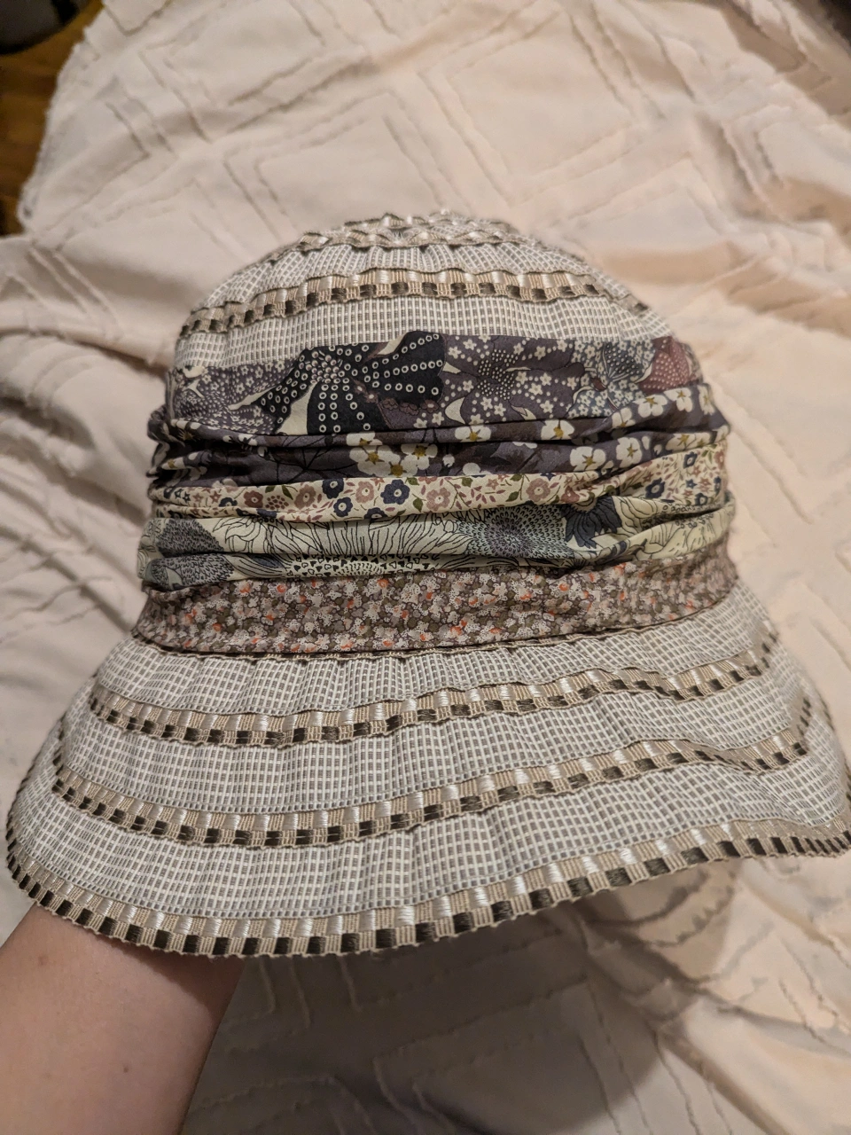 Floral sun hat with brown, cream, and grey pattern. Has a wide brim and is made of a lightweight fabric.