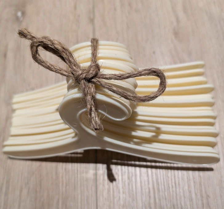 A lot of 20 white plastic hangers. Tied together with twine. Meant for hanging small dog clothes or accessories . Adorable.πŸ’– ⌨️πŸ₯•πŸ›’πŸ›οΈπŸΎ