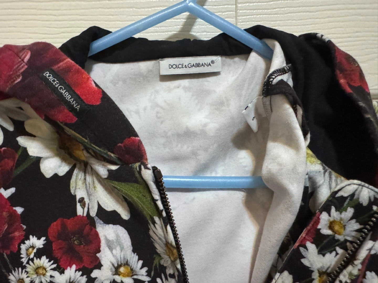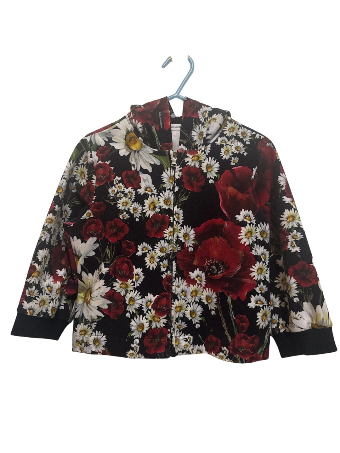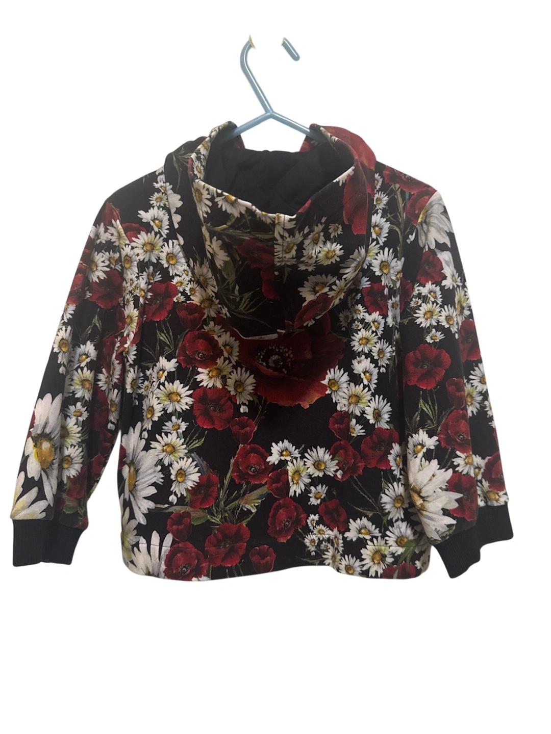 Black zip-up hoodie with white and red floral print. Long sleeves and a hood. Size 6 (113-119 cm) fir small so recommended 5-6 Toddler