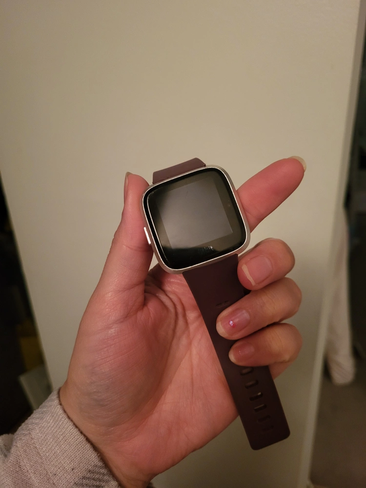 Smartwatch with a purple band. Screen has small scratch pictured.