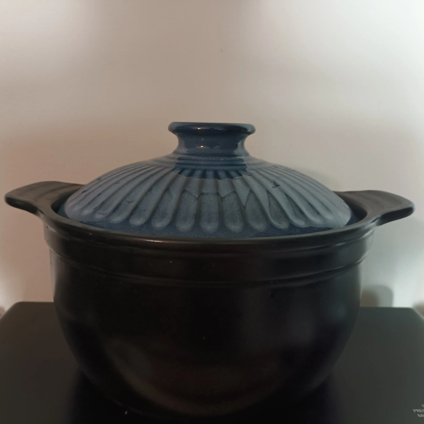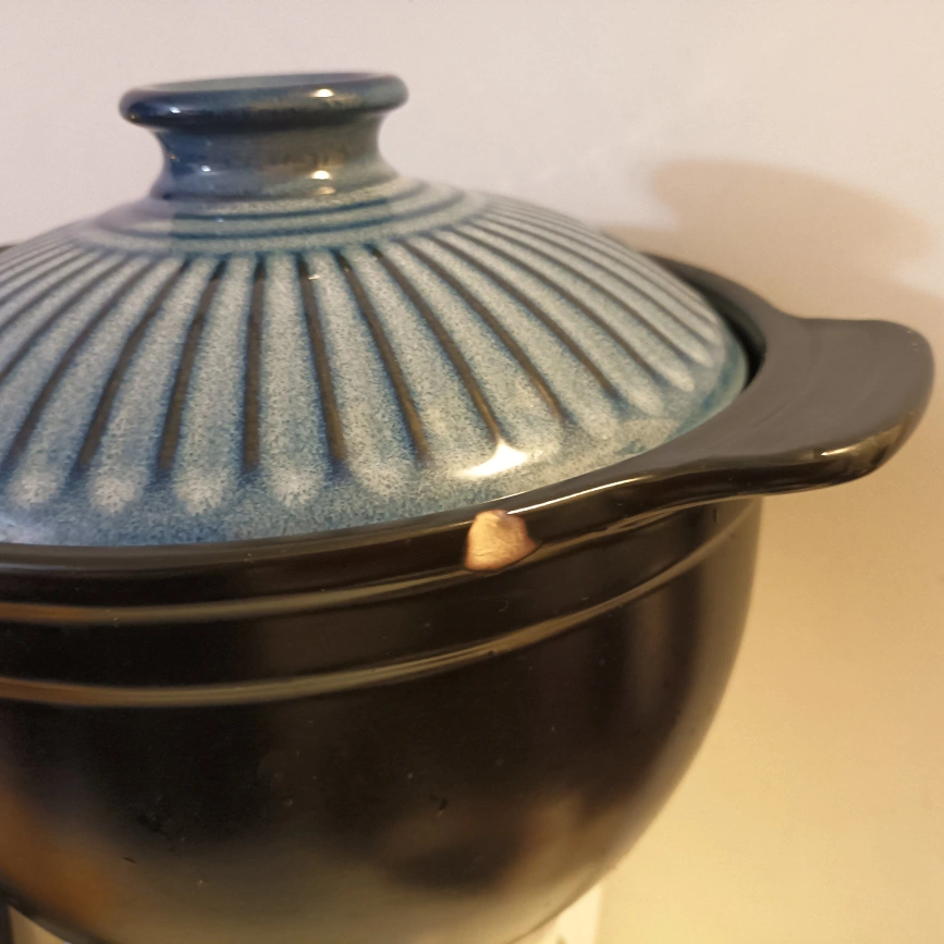 Black ceramic pot with blue lid. The lid has a small chip on the edge.