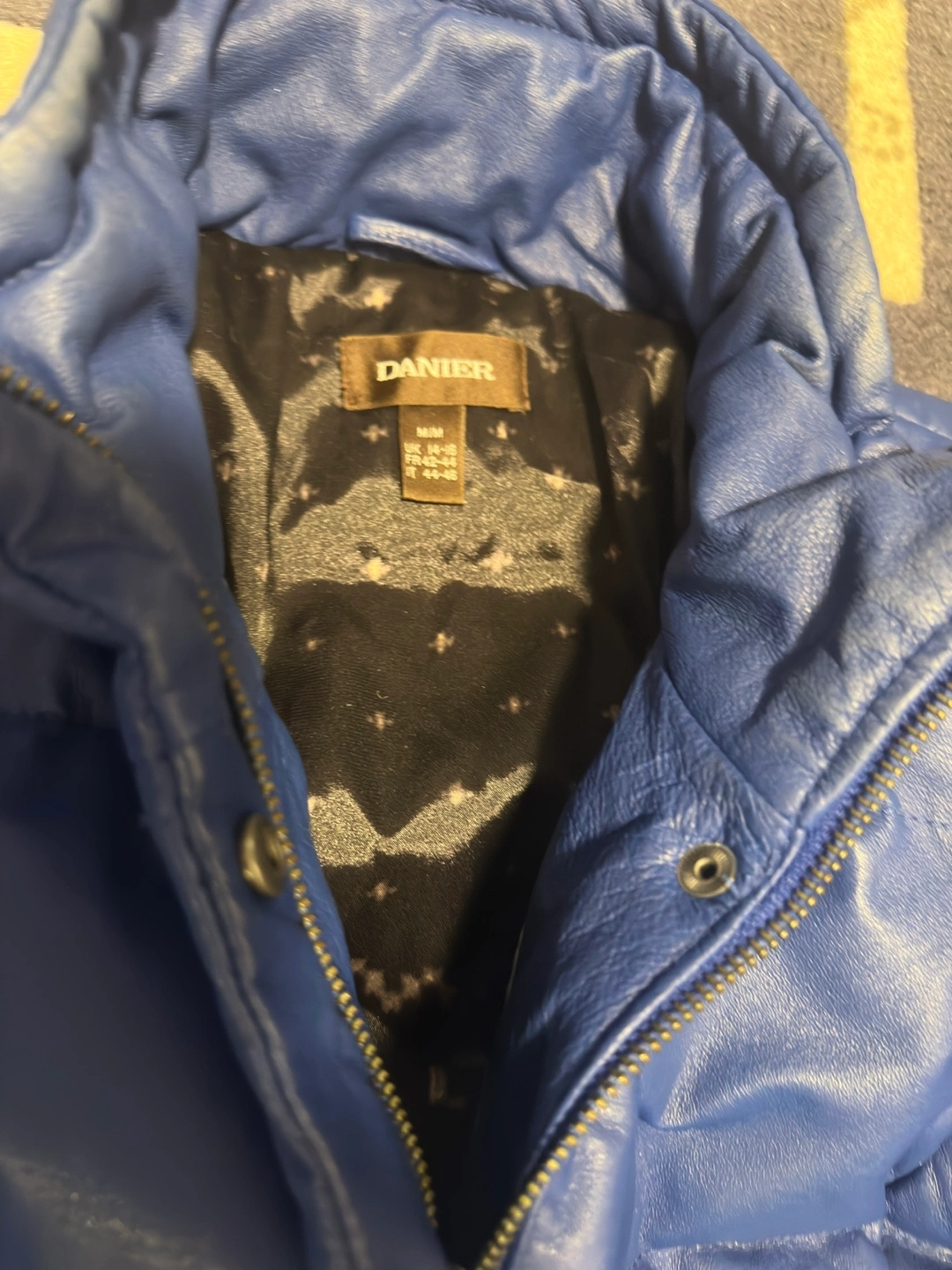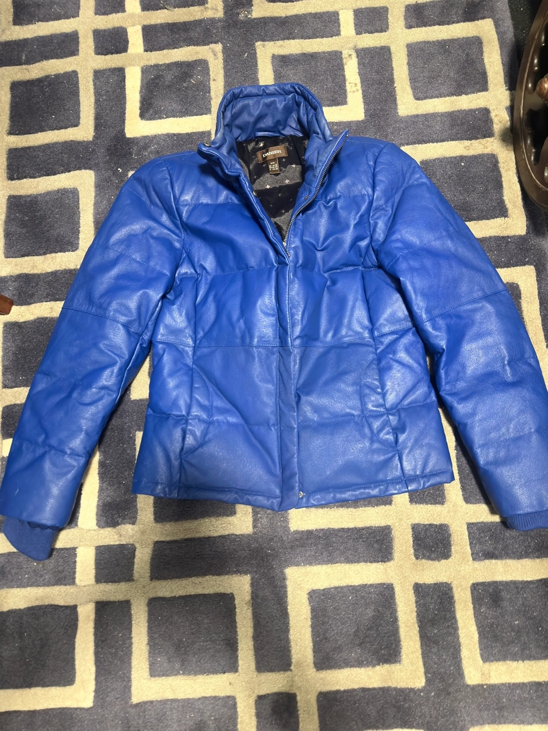 Blue leather puffer jacket. Zipper closure and two pockets. Size Medium.