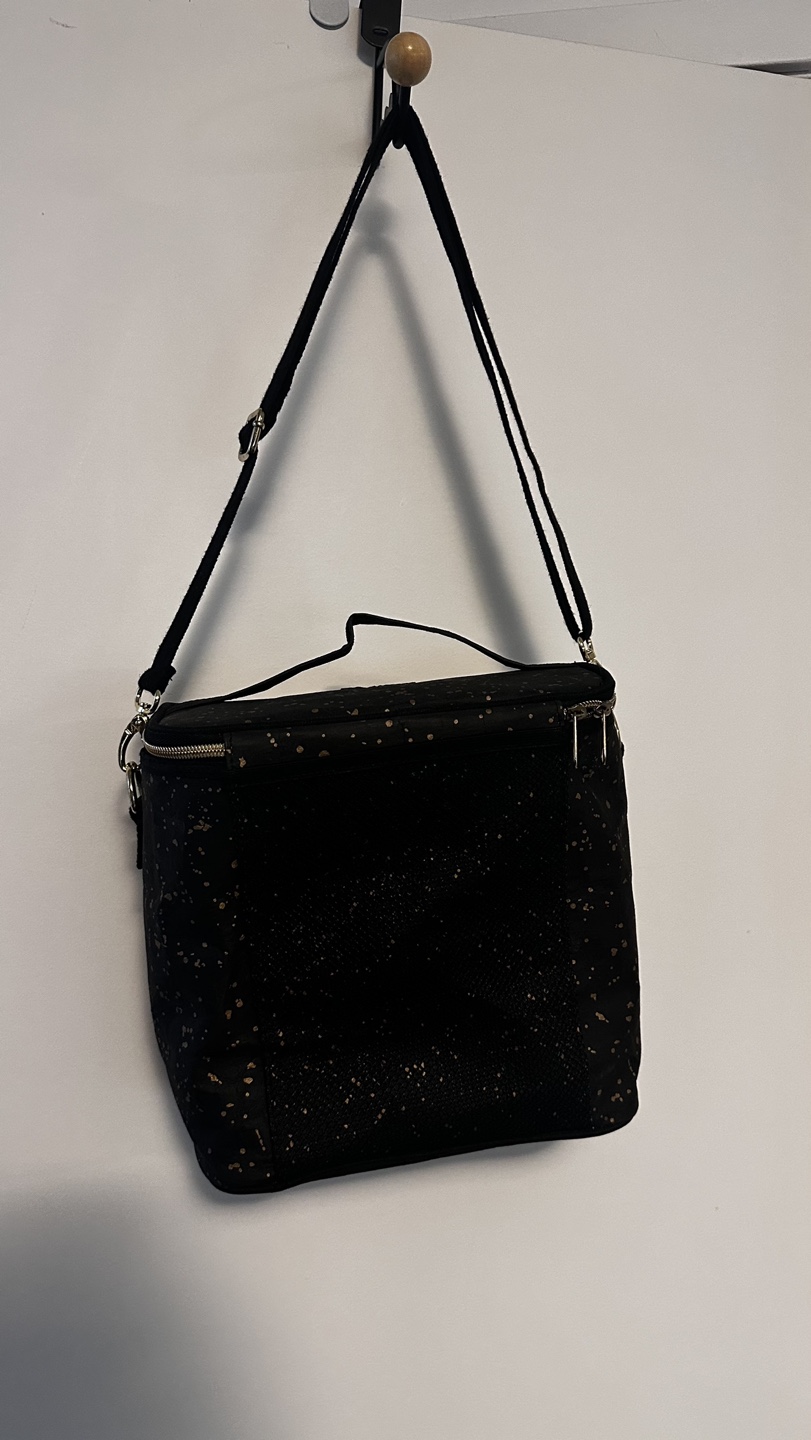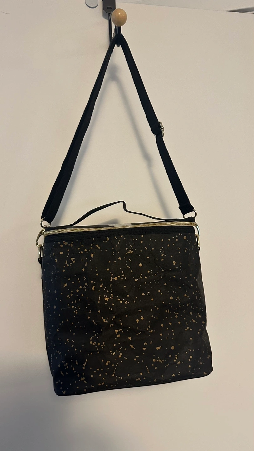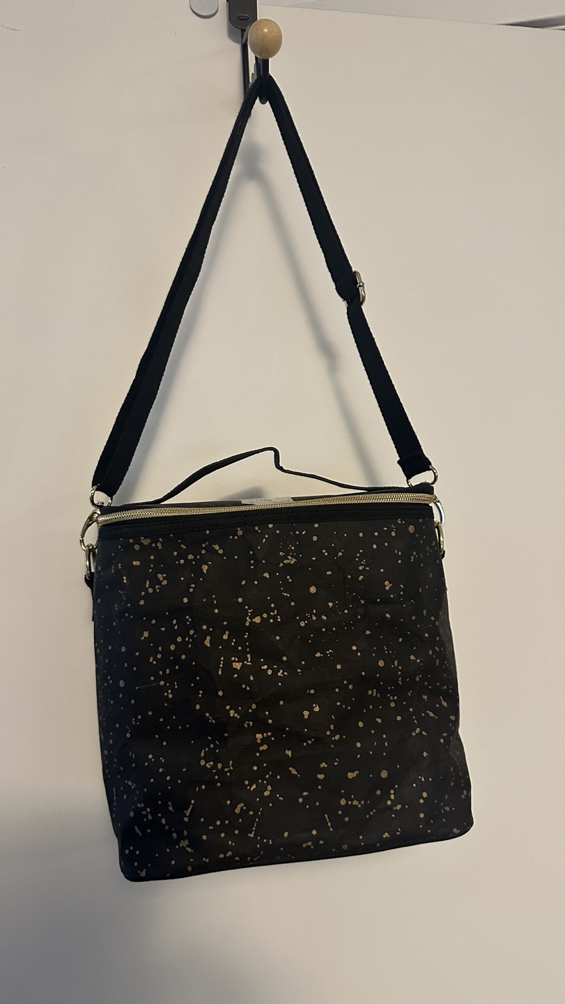 Black lunch bag with gold splatter design. Features a long adjustable strap.