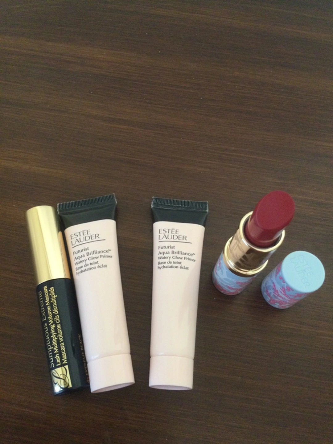 Bundle includes Estee Lauder Sumptuous Extreme Lash Multiplying Volume Black Mascara 2.8 ml, Estee Lauder Futurist Aqua Brilliance Watery Glow Primer 15 ml each x2, Estee Lauder Pure Color limited edition lipstick rouge Palm Beach Chic full size