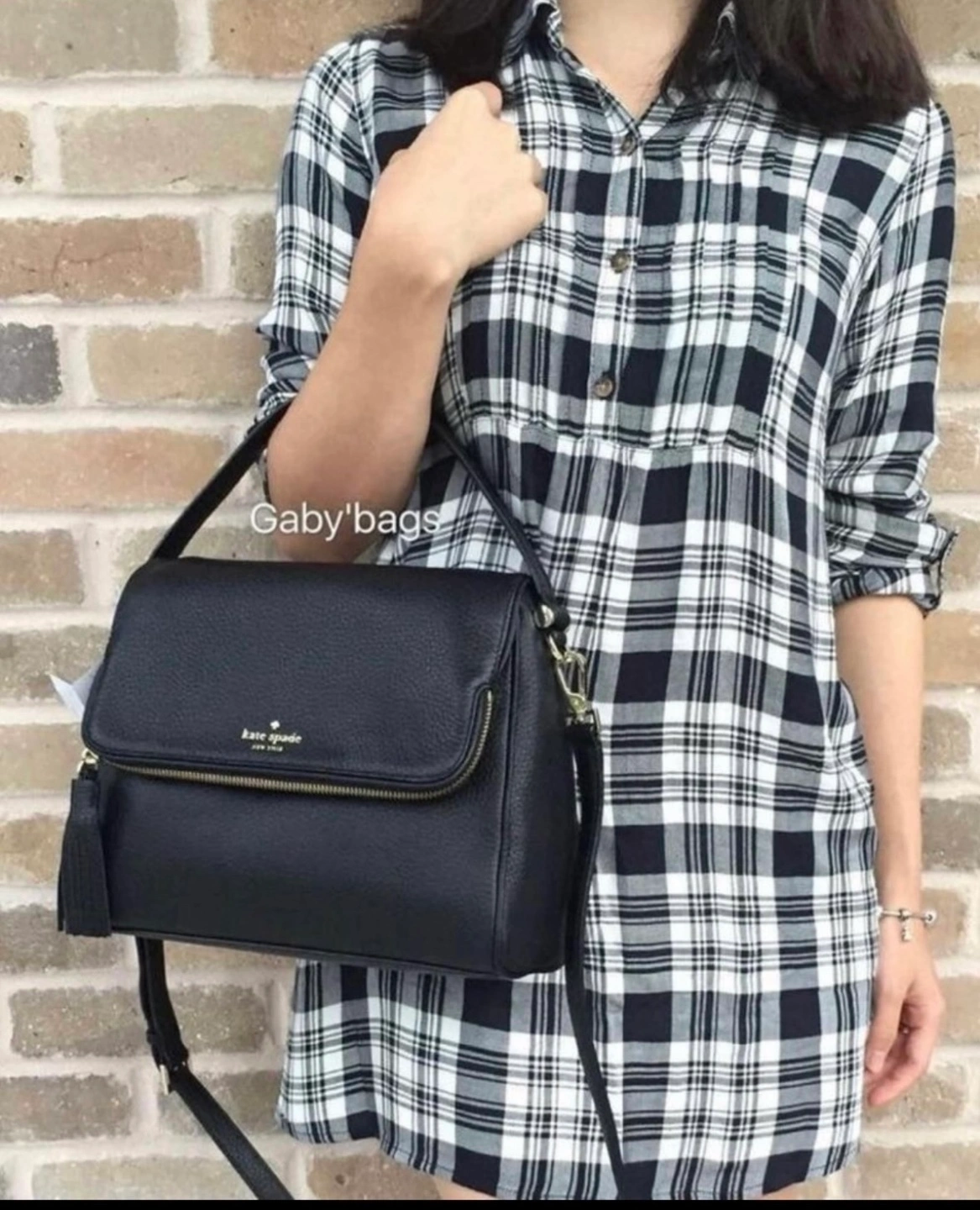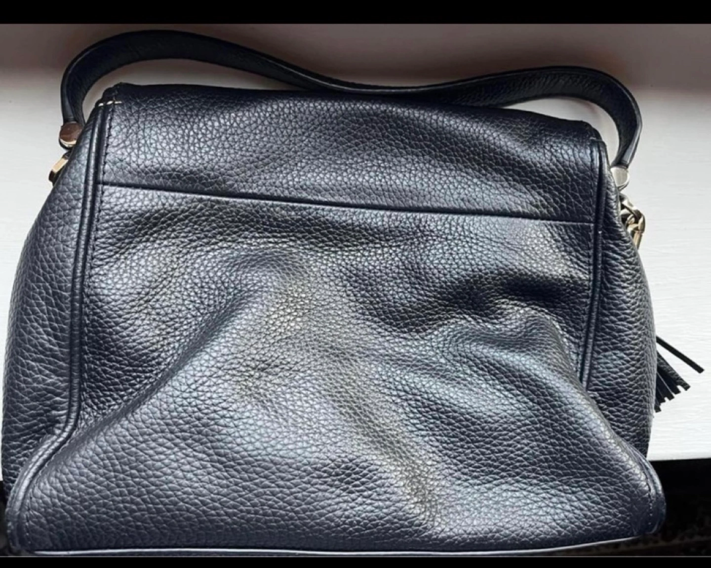 Only thing is a little Minor defect on back of purse on leather but are barely noticeable. You can see where I circled. This crossbody can be removable and adjustable strap, and a short shoulder strap. Peddled leather, flap with magnetic snap closure. Tasseled zip pocket.Approximate dimensions: 11 in x 8 in x 4.25 in
