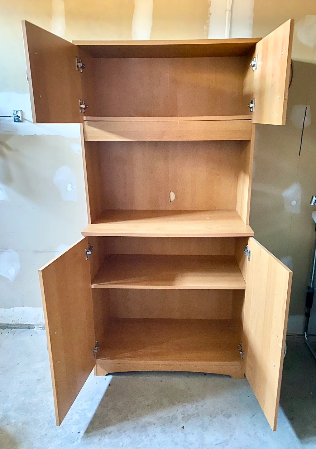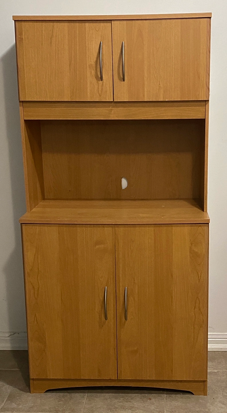 Large kitchen cabinet with shelves, two doors on the top and two on the bottom. Open shelves in the middle section with a hole for wiring.