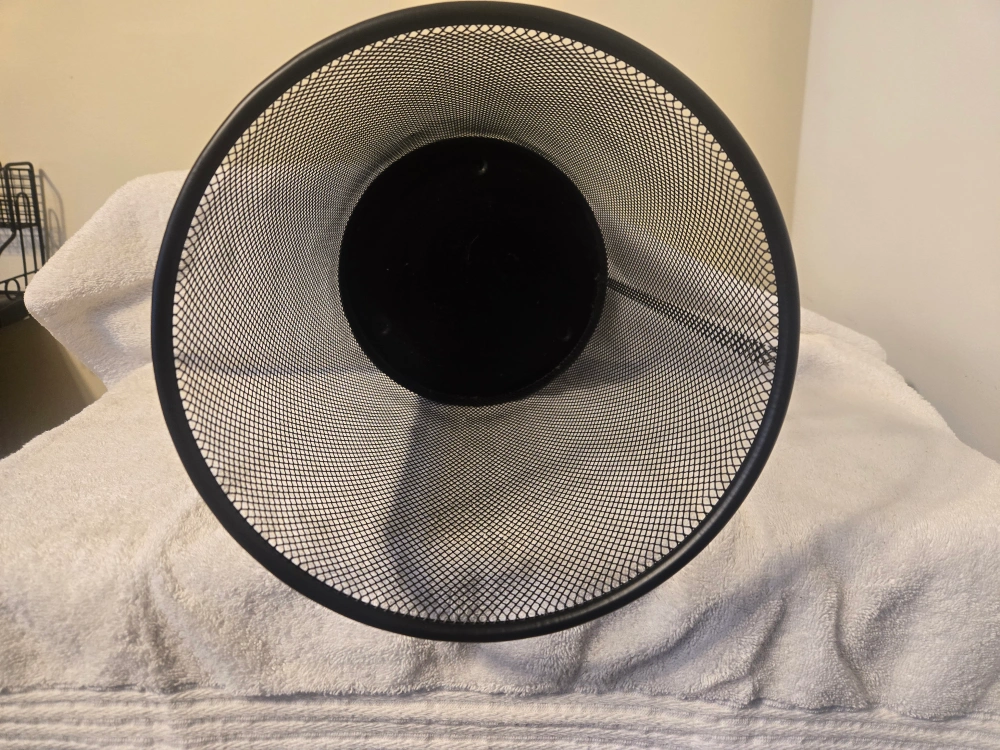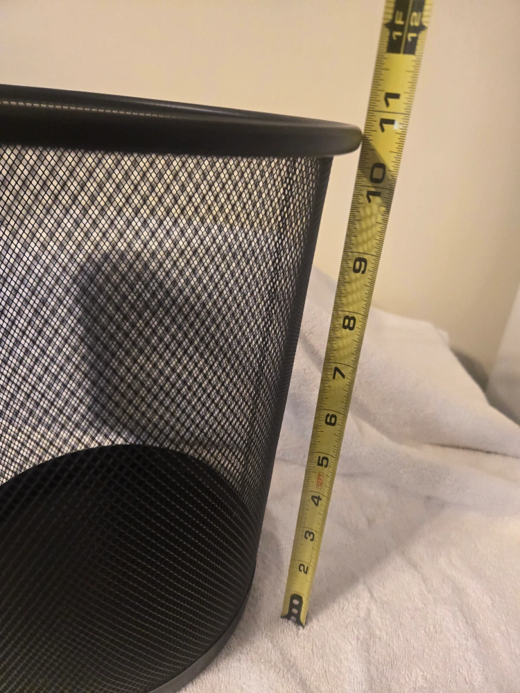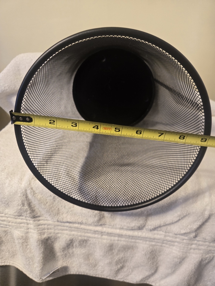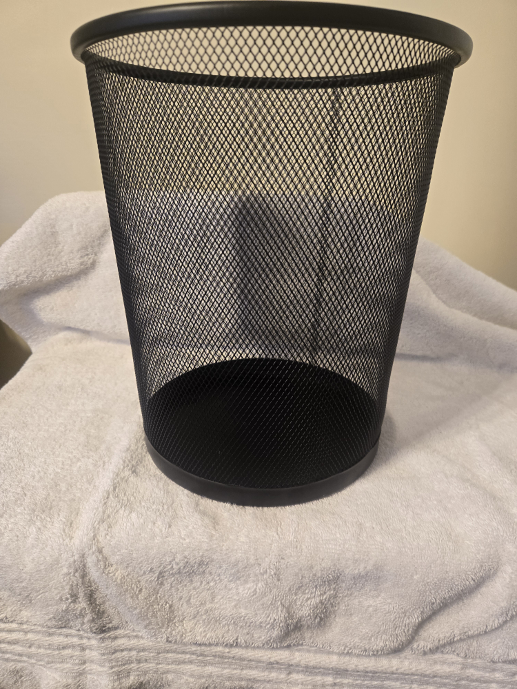 A simple metal waste paper basket/garbage can. no longer using it. in very good condition. The tape measure is used for size reference.