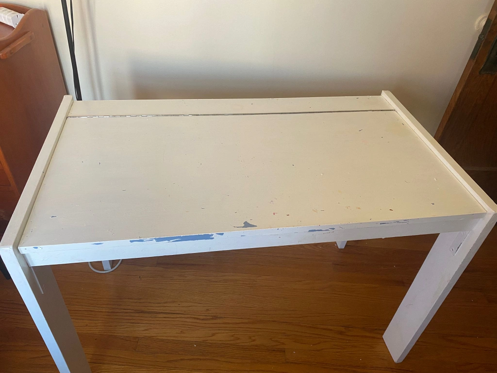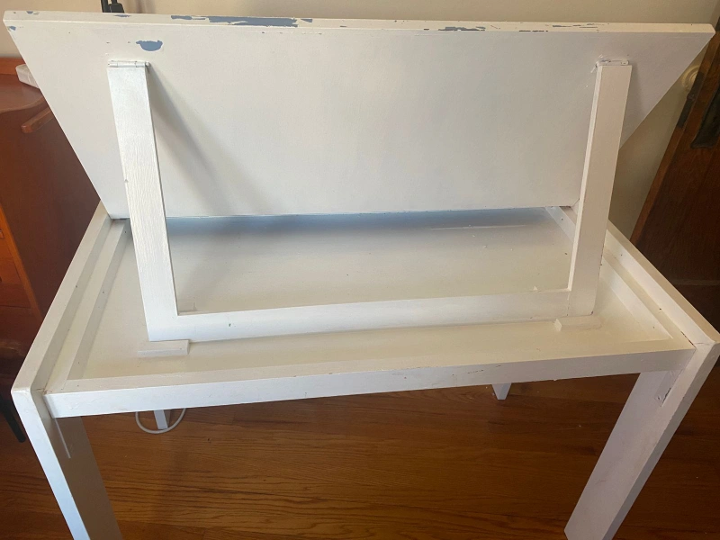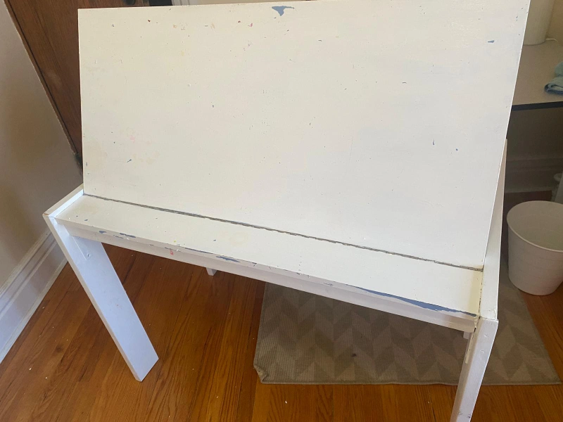 White tilt-top desk with some wear and tear. Has an easel and a storage. Great for a child's room.