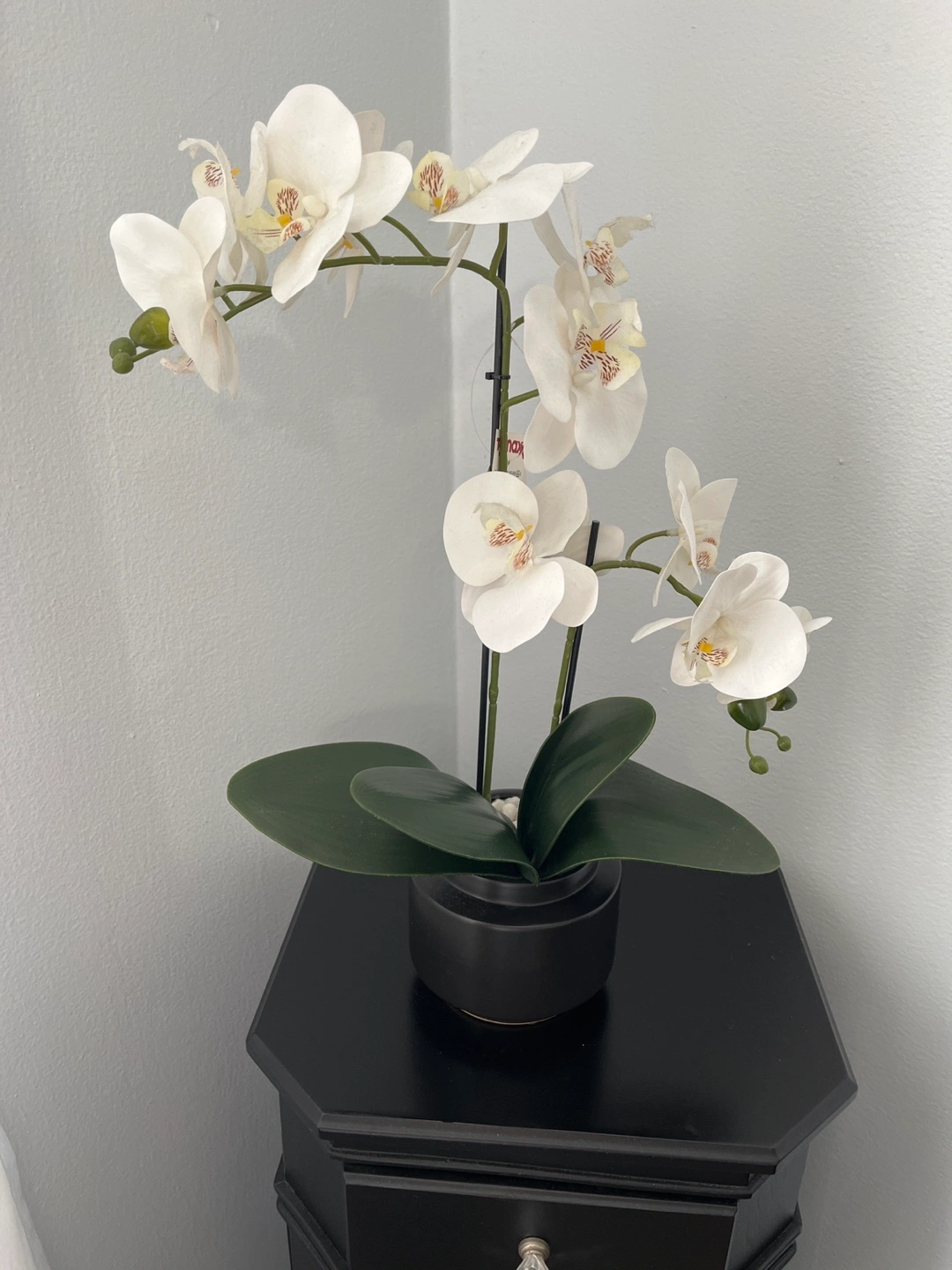 New Artificial orchid plant with dark brown base. Has lots of orchids and white stones in the base. Approximately 18 inches high. Pick up not available from 11-4 to 11-18