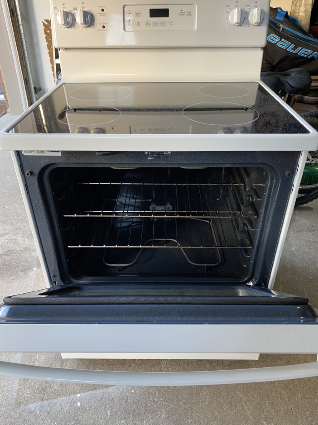 30” White electric stove with four burner stovetop and oven. Excellent condition, comes with two racks, only 6 months old. Self Cleaning with Steam Cleaning option