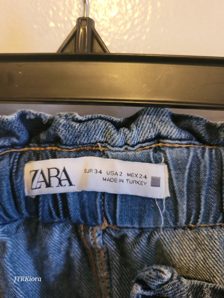 Blue denim jeans with a relaxed fit. Elastic waistband with drawstring. Five pockets.