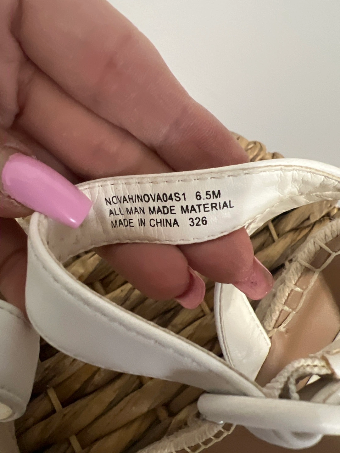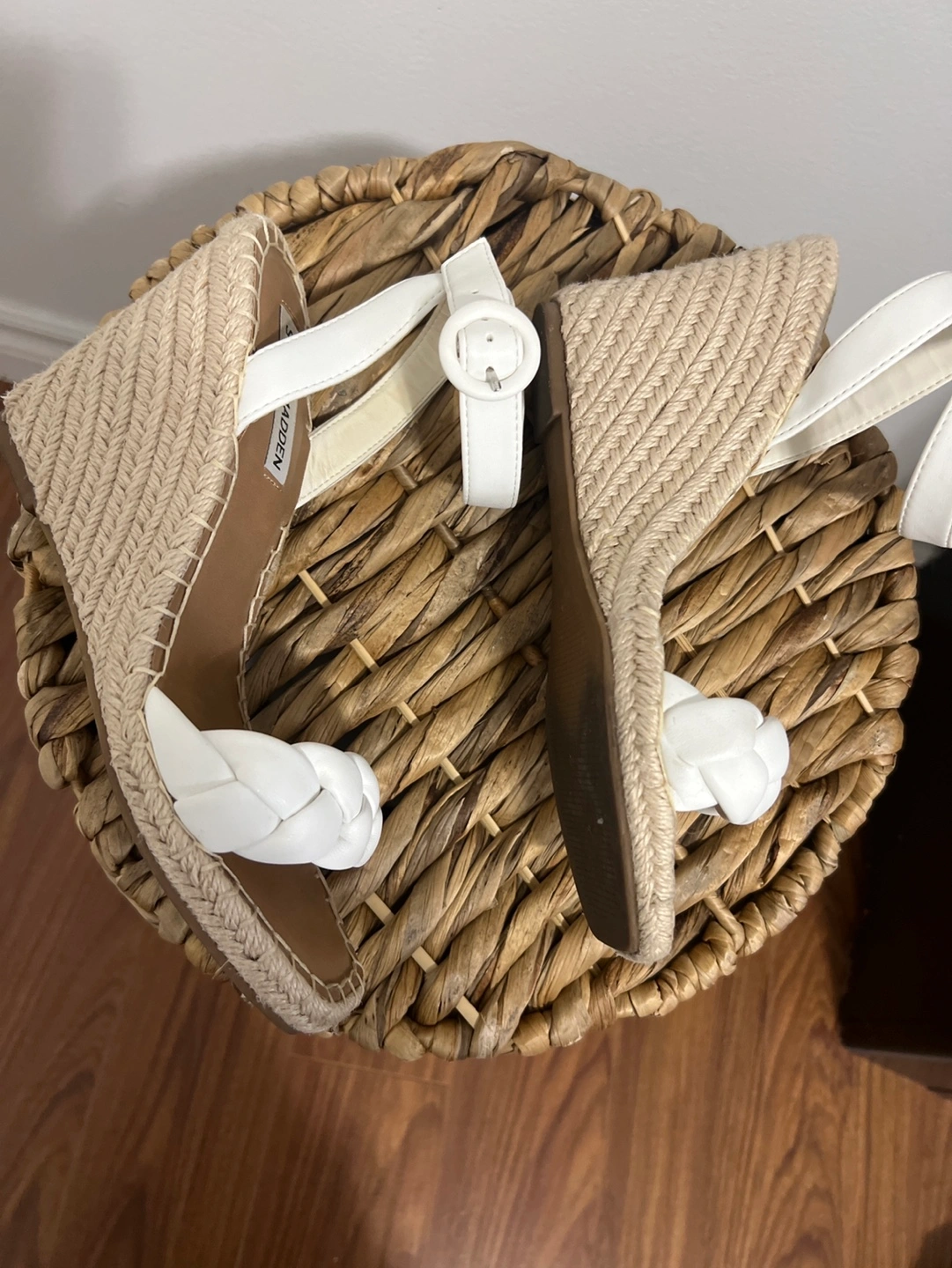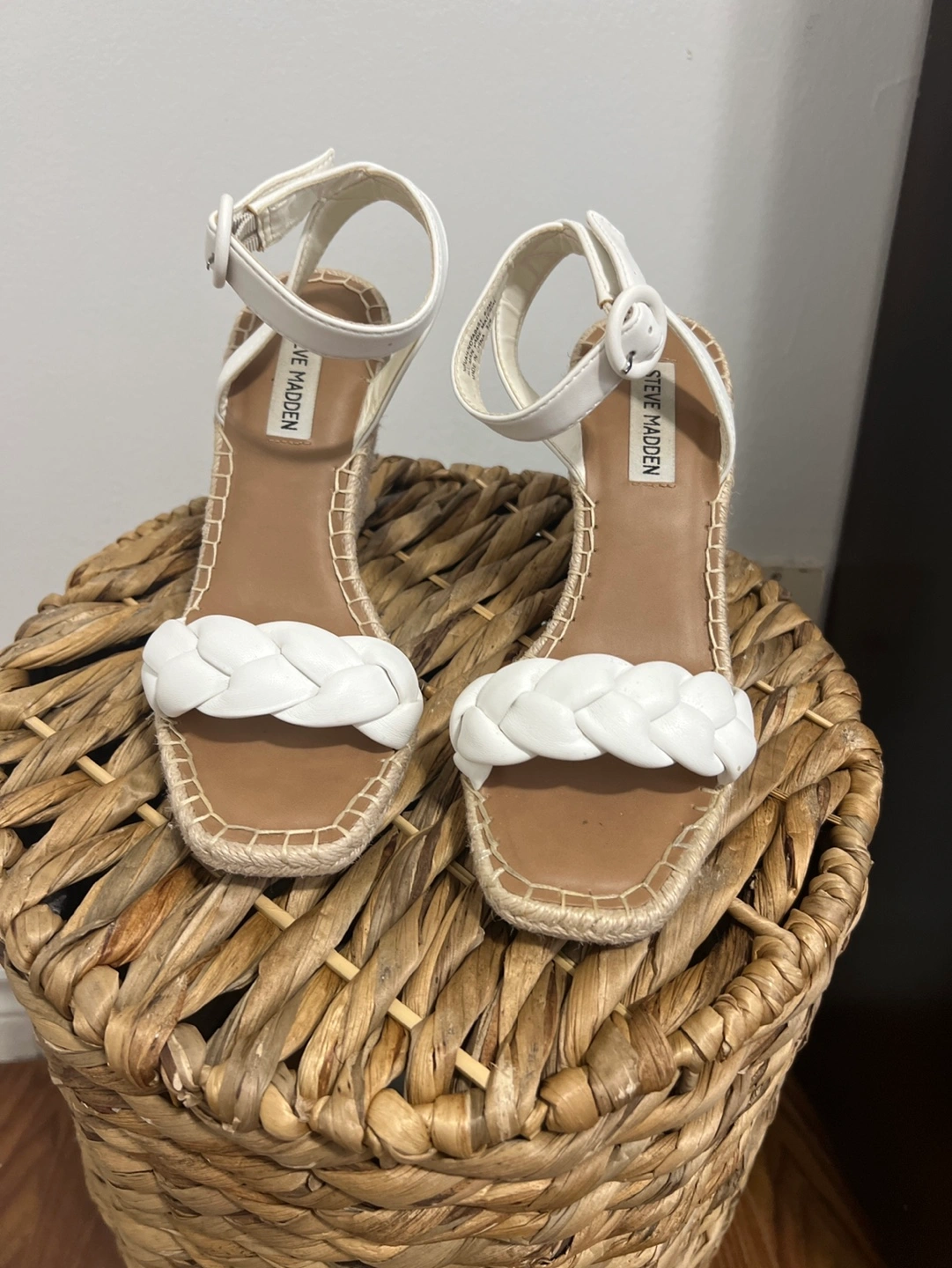 96White braided wedges with ankle strap and a jute platform. Size 6.5M.