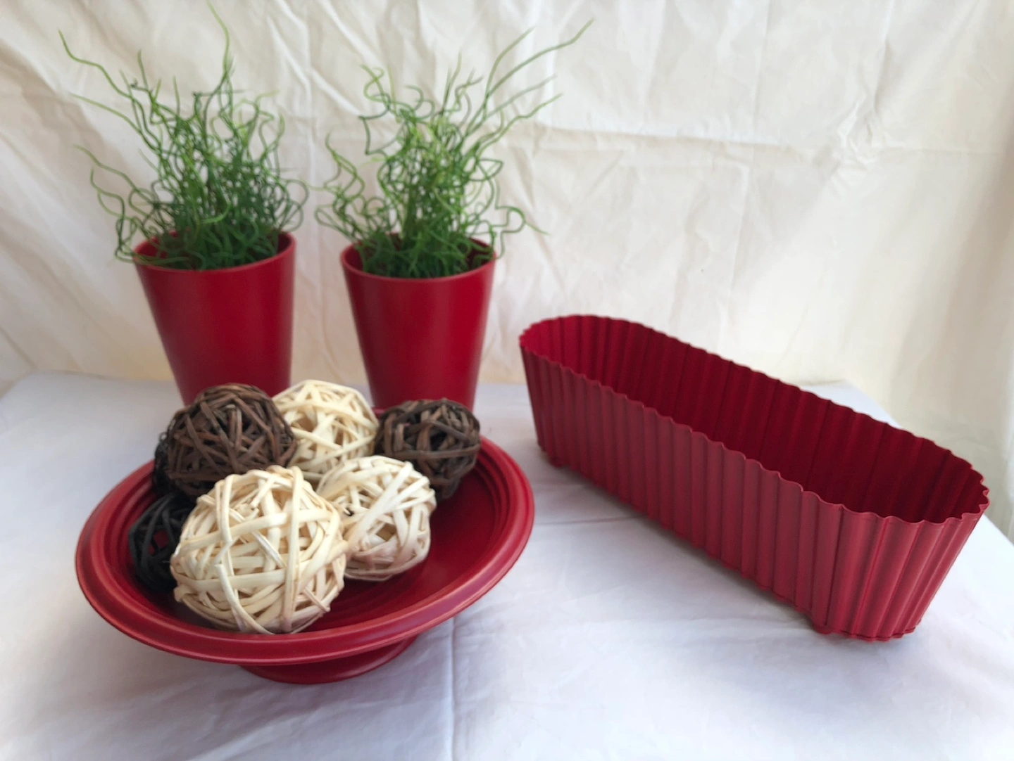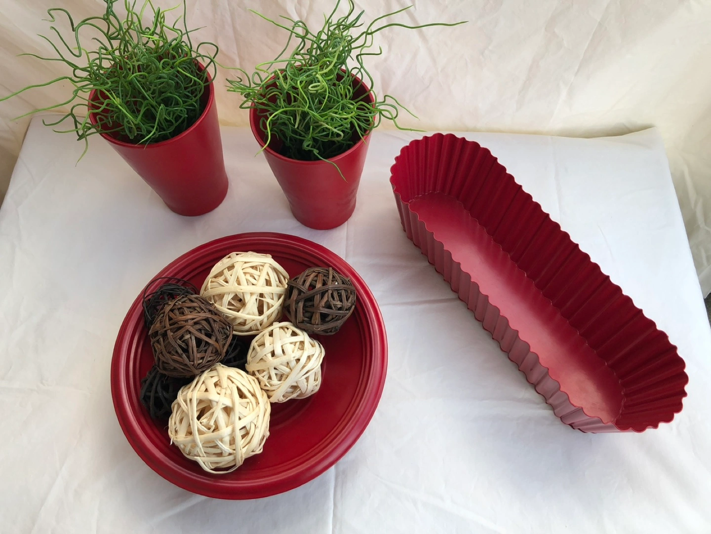 10Red vases with greenery, accent bowl, long bowl