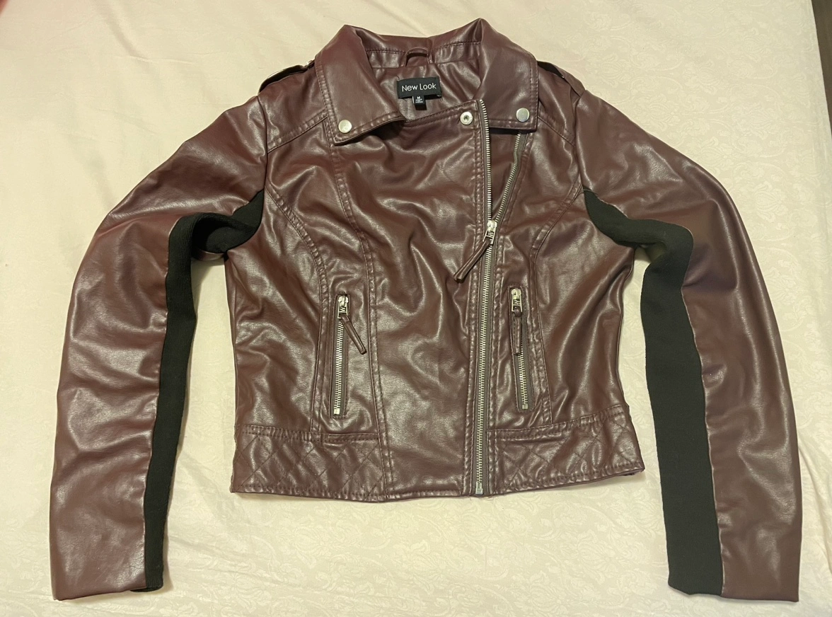 Burgundy faux leather jacket, motorcycle style. Tag says medium but fits like a small.