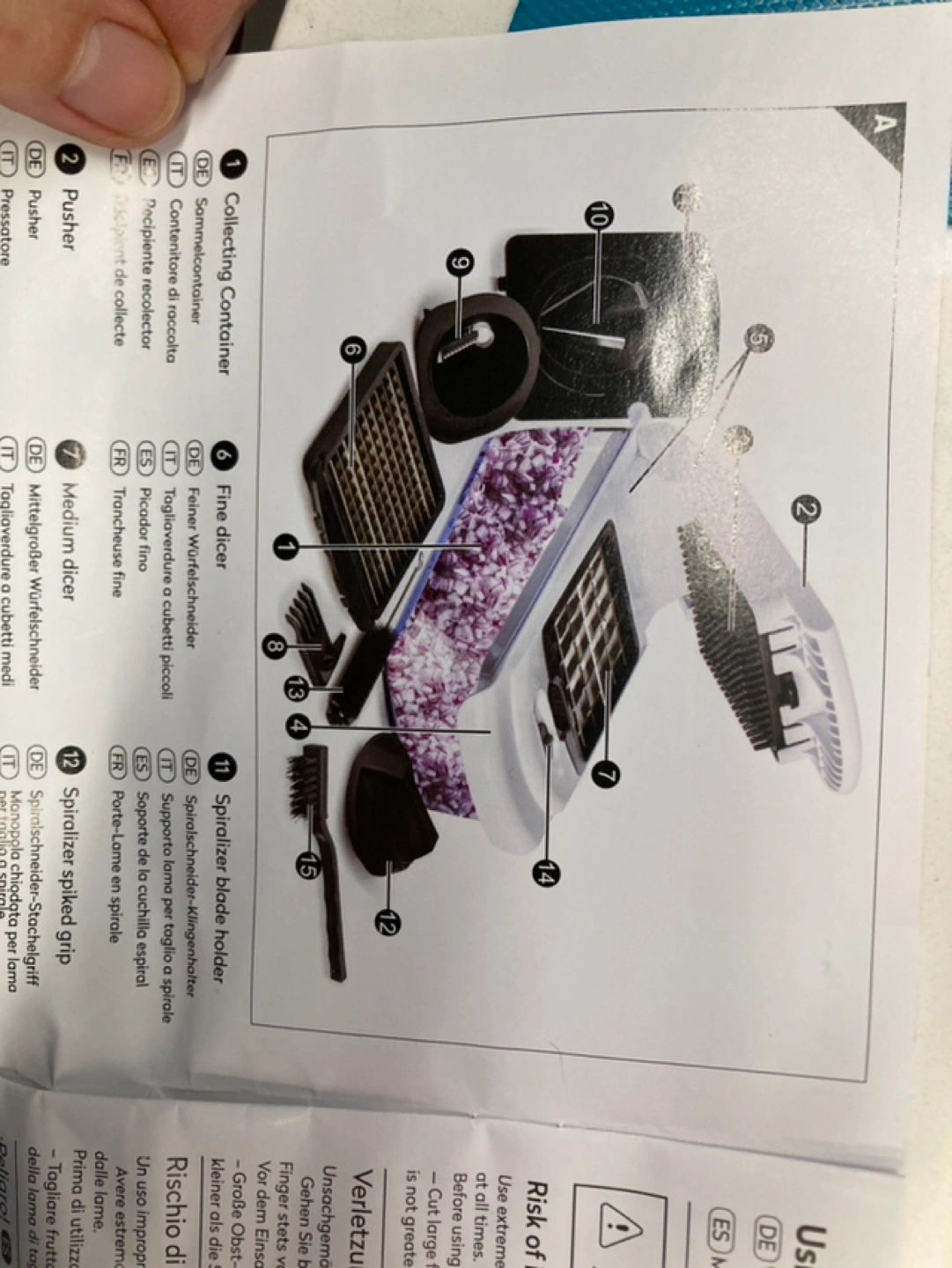 Comes with a variety of blades and a container.