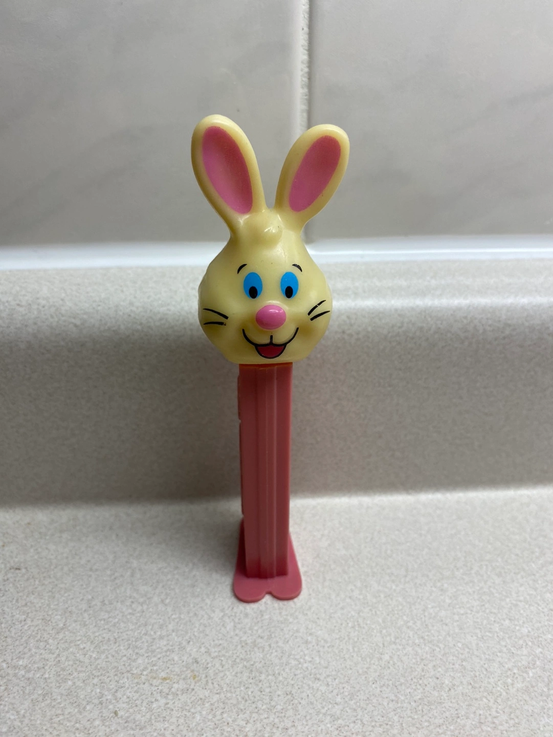 Vintage Pez dispenser in the shape of a bunny. Pink body with a yellow head and pink ears. Blue eyes.