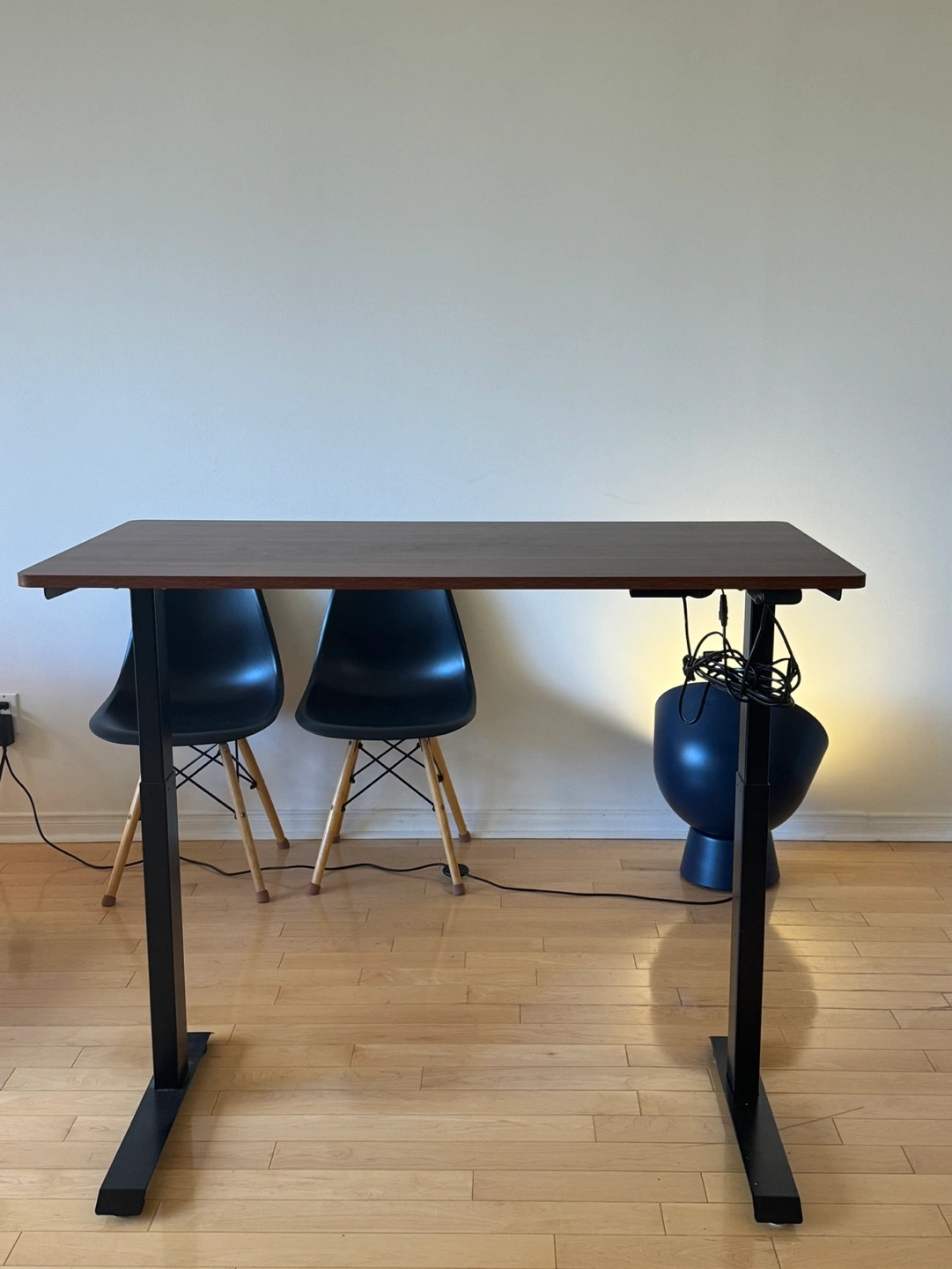 Electric standing desk with a walnut finish. Includes a power outlet and cable management system. Good condition.