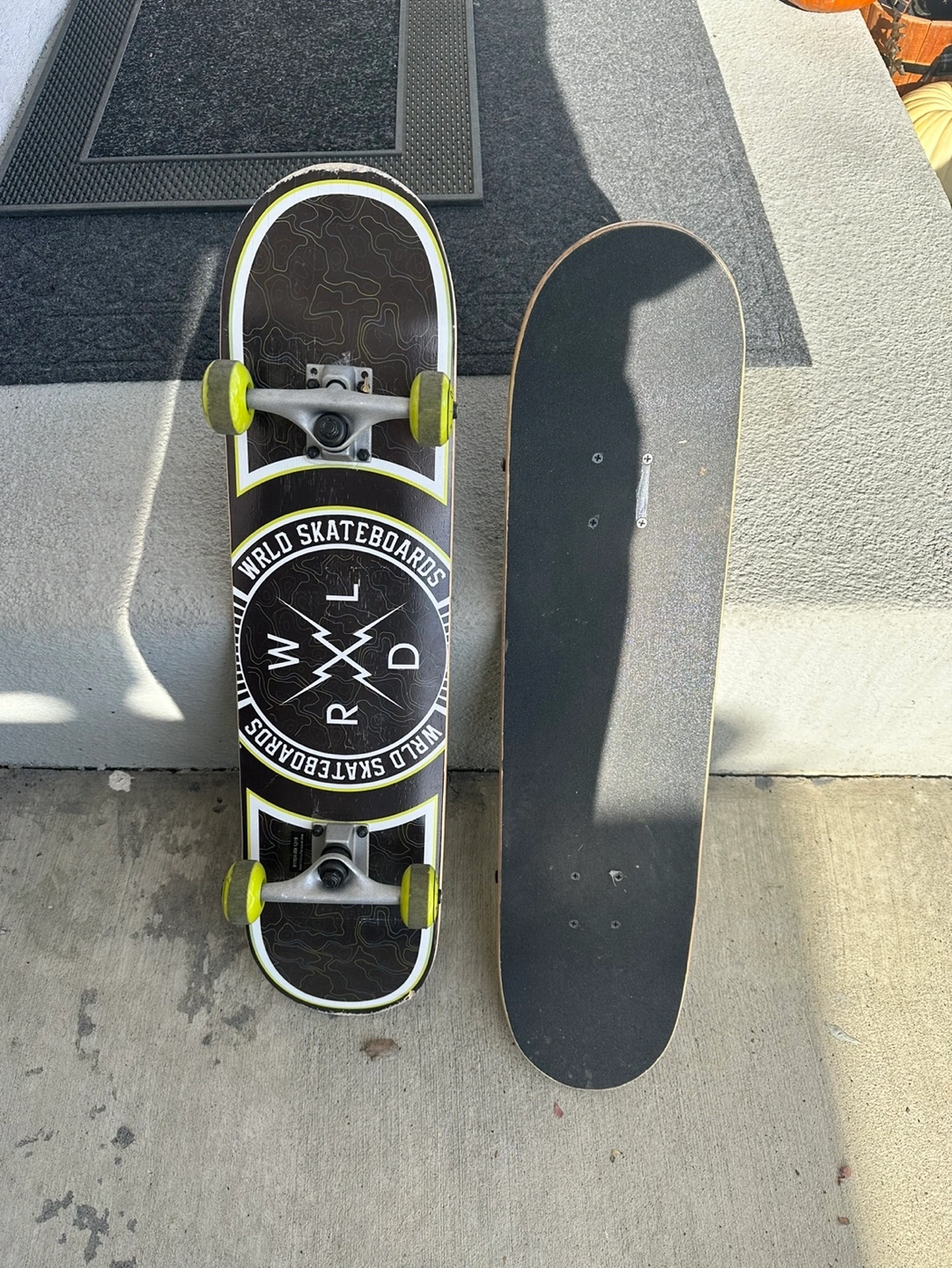 Complete skateboard with black deck and yellow trucks. WRLD logo on deck.