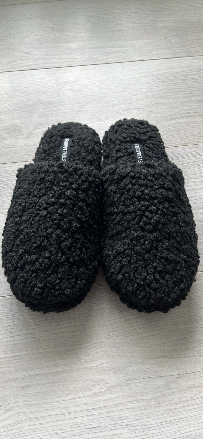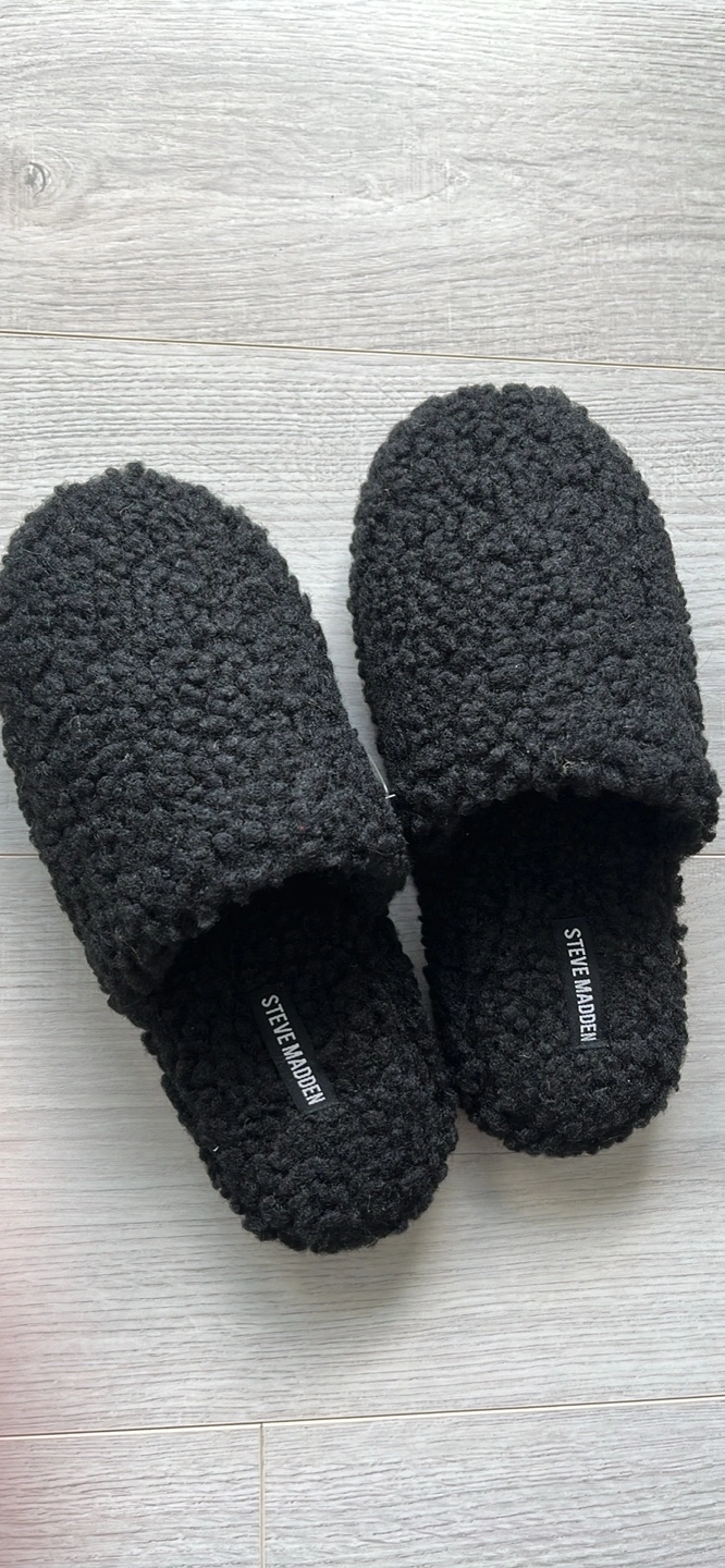 Brand new, never worn black fluffy Steve Madden slippers. Size medium. I’m a size 7 normally and these fit perfectly!