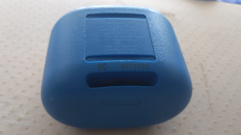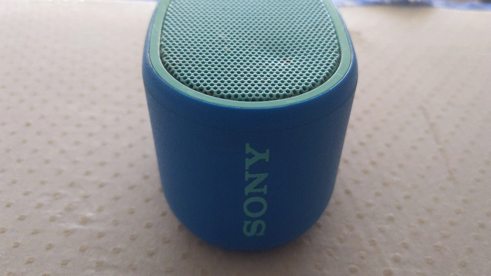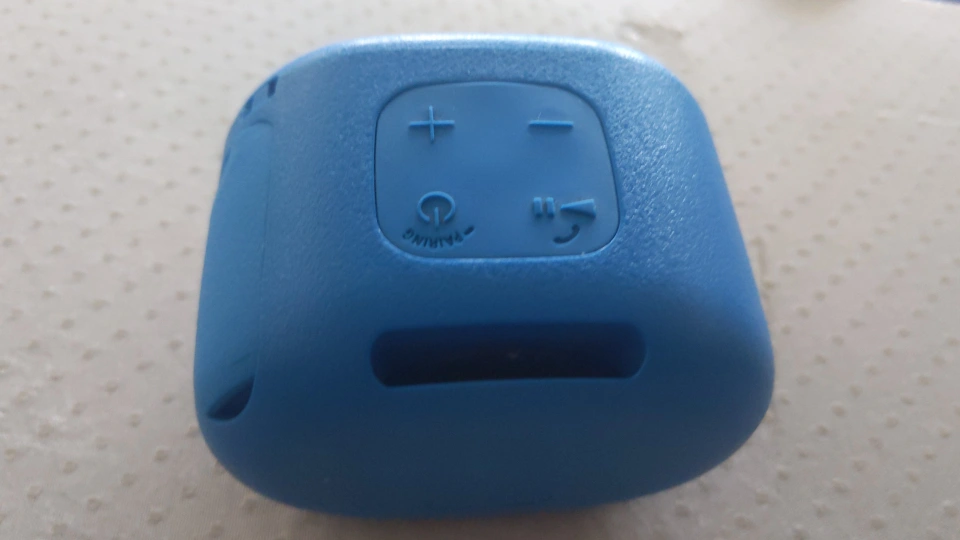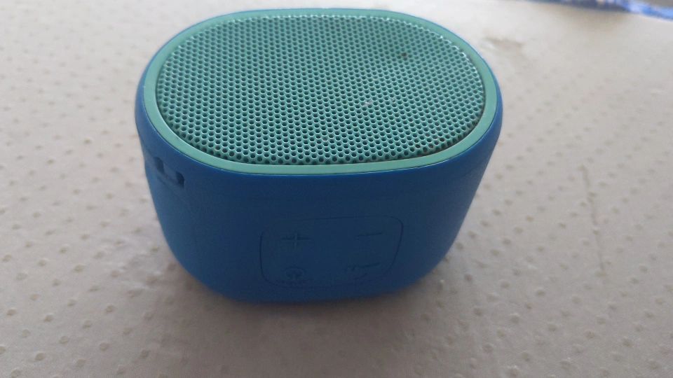 Small blue and green portable Bluetooth speaker. Has volume controls. Used and dented near the speaker