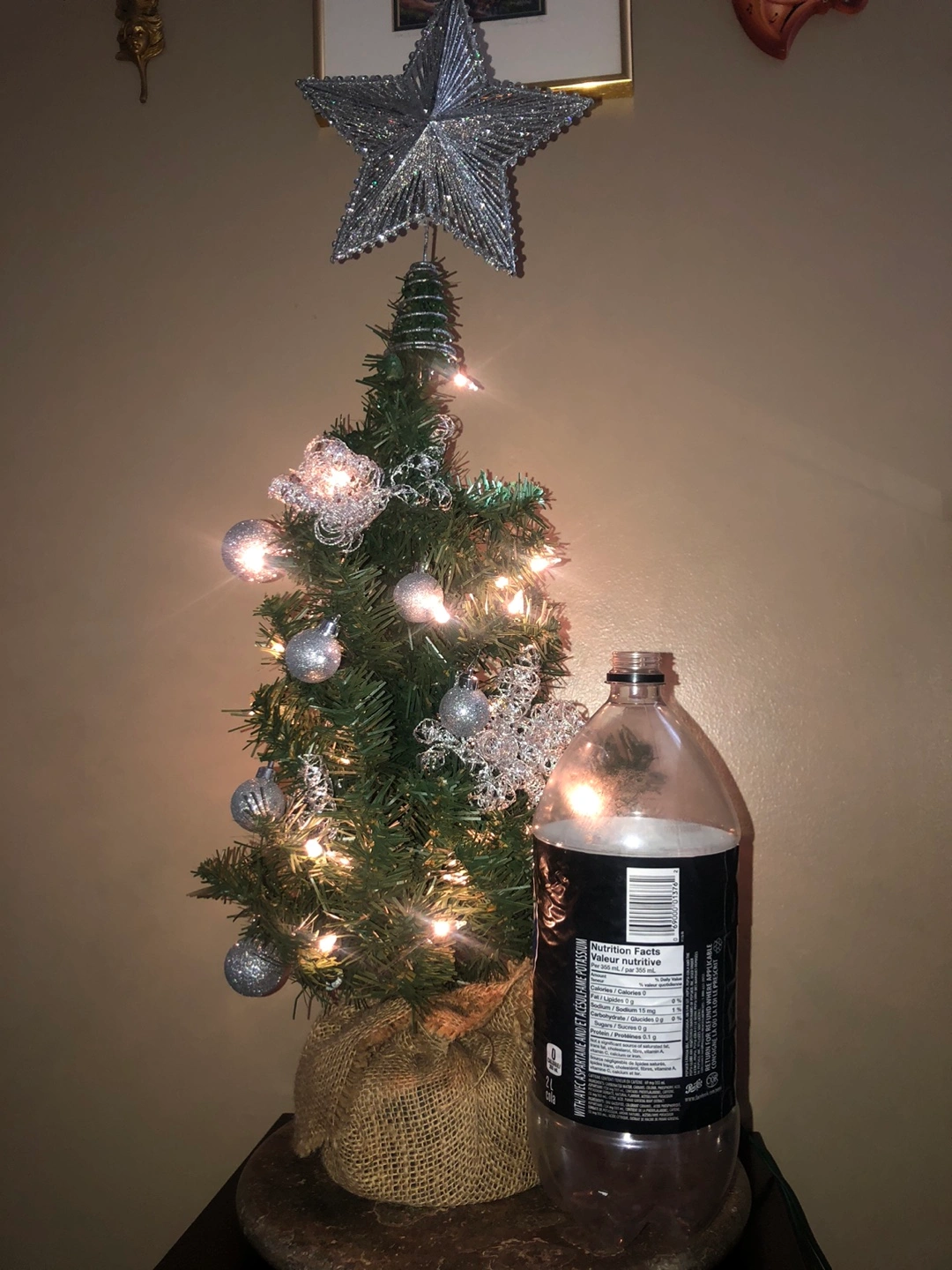 Small artificial Christmas tree with lights. Includes burlap base and silver star topper. Comes with ornaments.