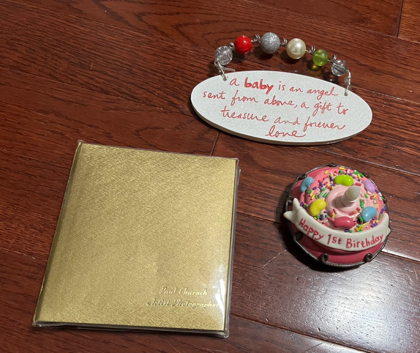 One wooden sign: A baby is an angel sent from above, a gift to treasure and forever love