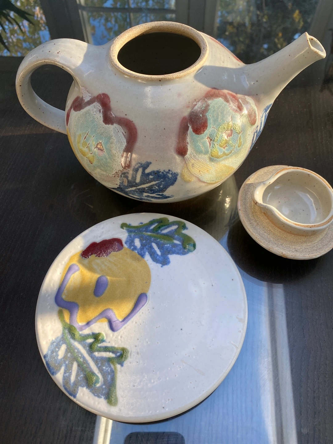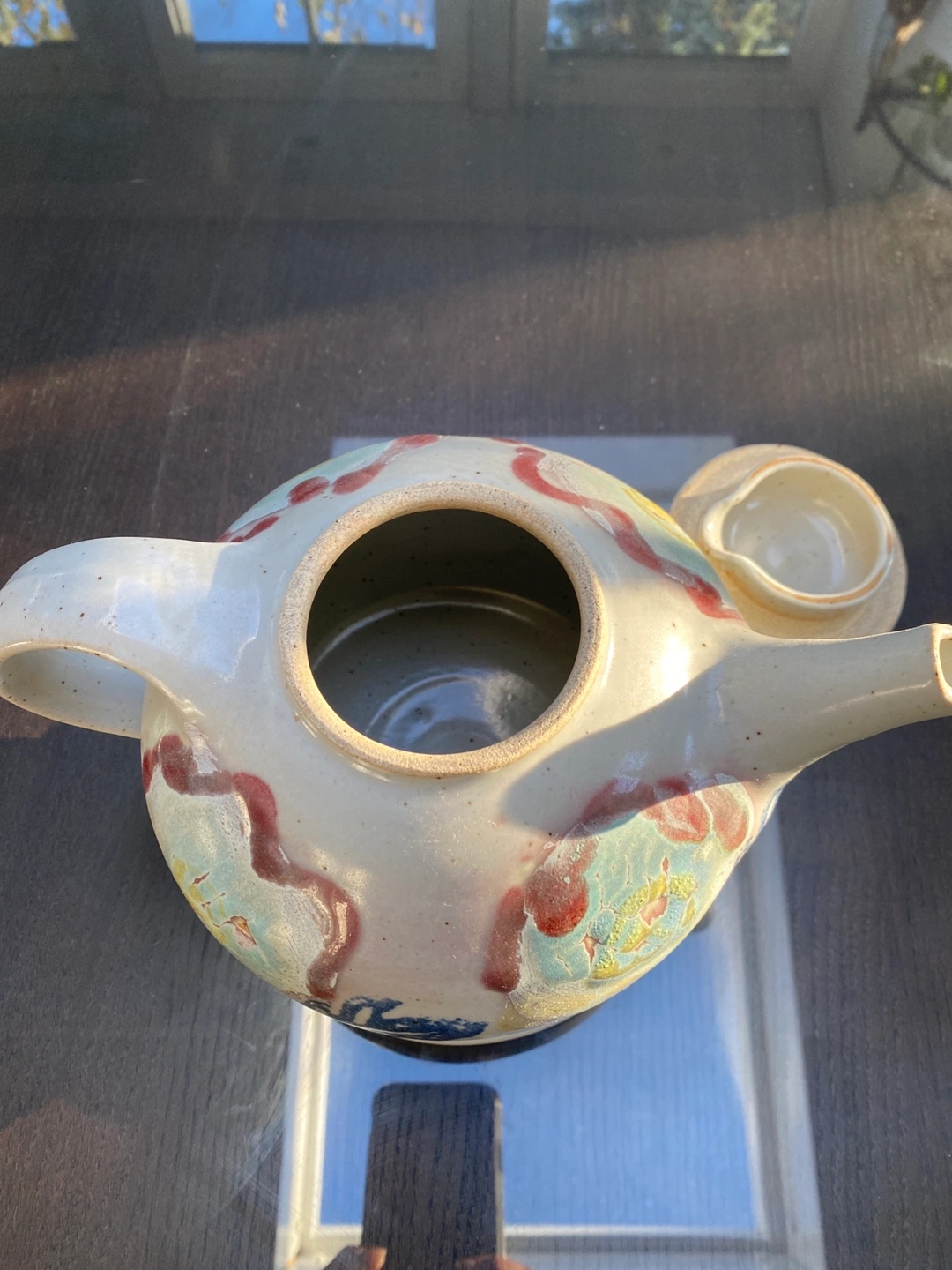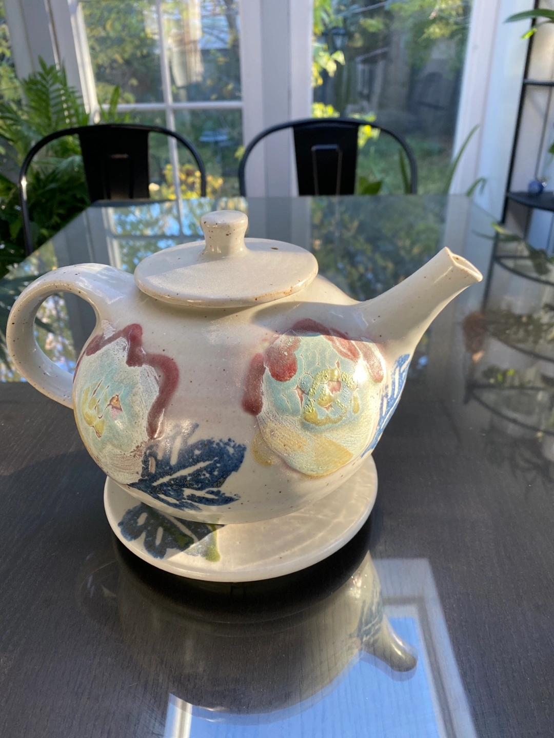 50Hand-painted ceramic teapot with a matching stand. Features a floral design in shades of blue, red, and yellow.