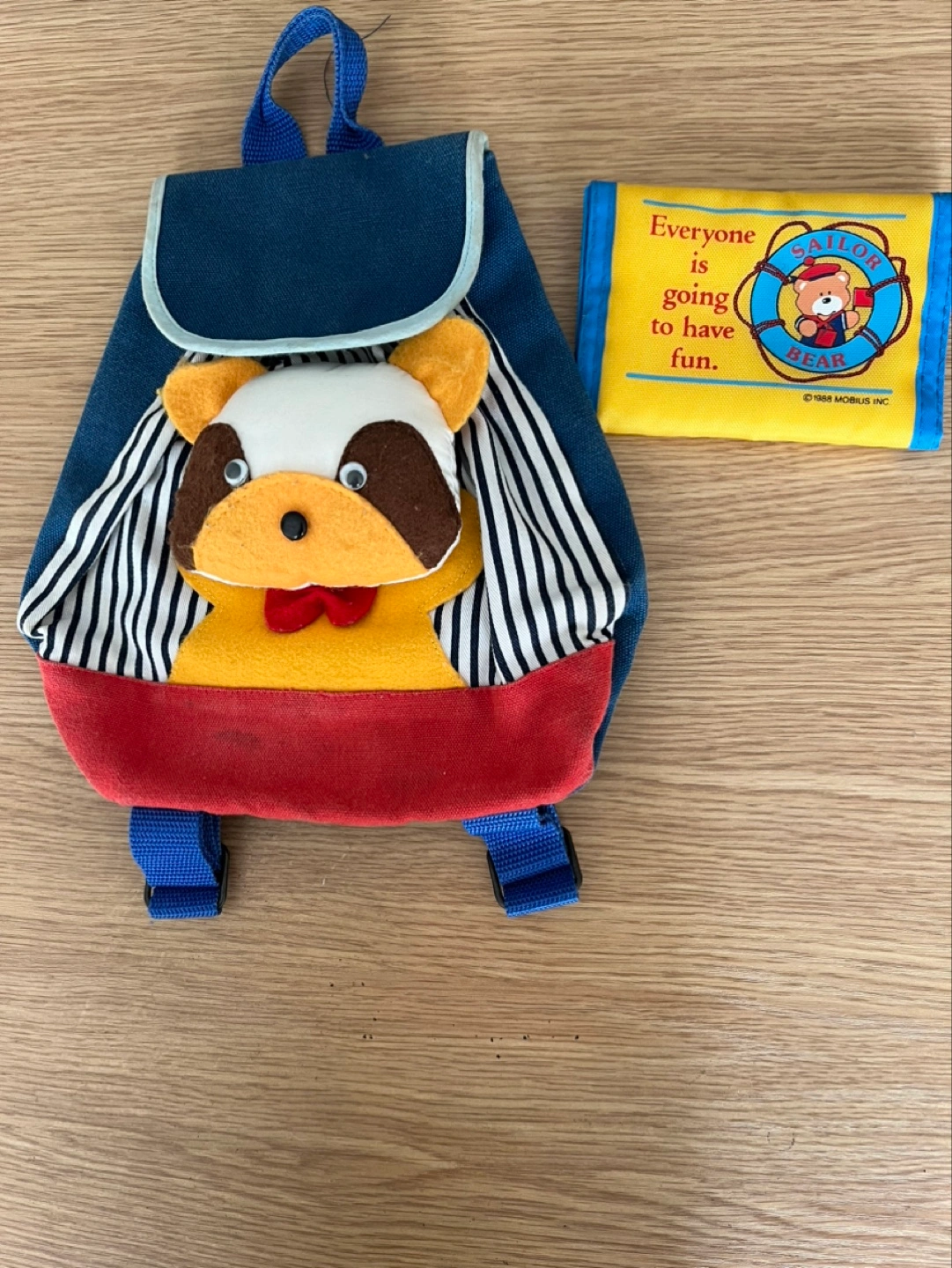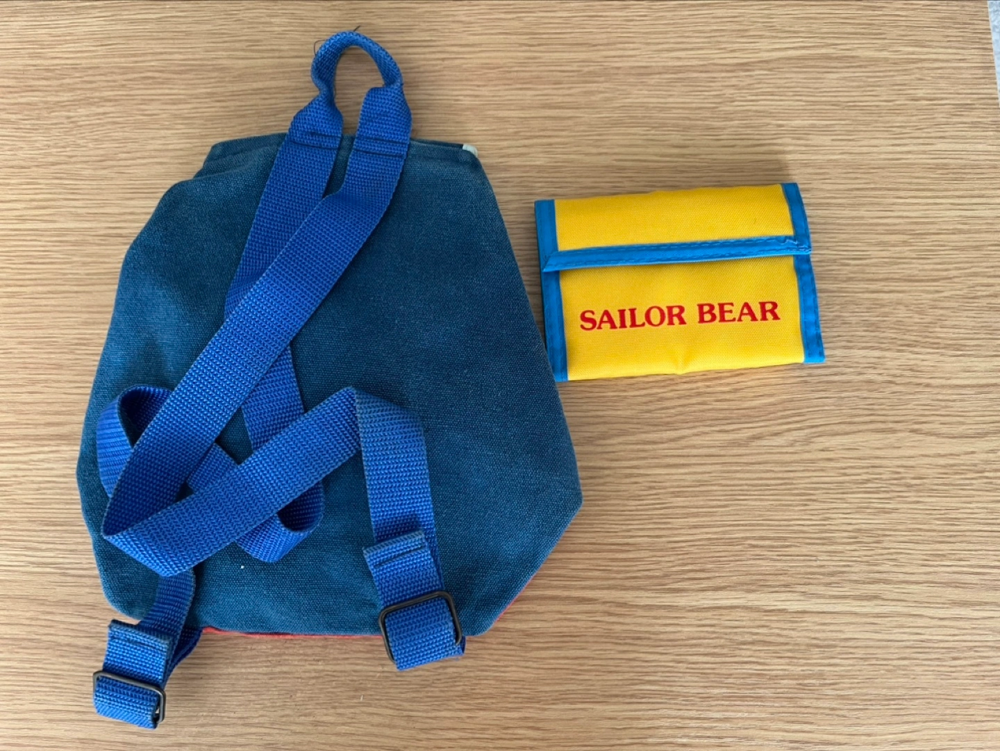 Small blue canvas backpack with a bear face. Includes a matching yellow wallet with a sailer bear logo.