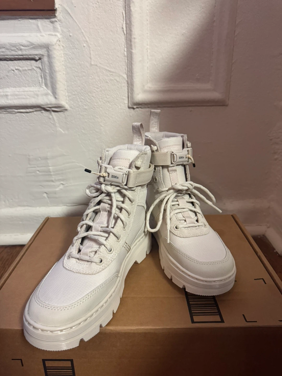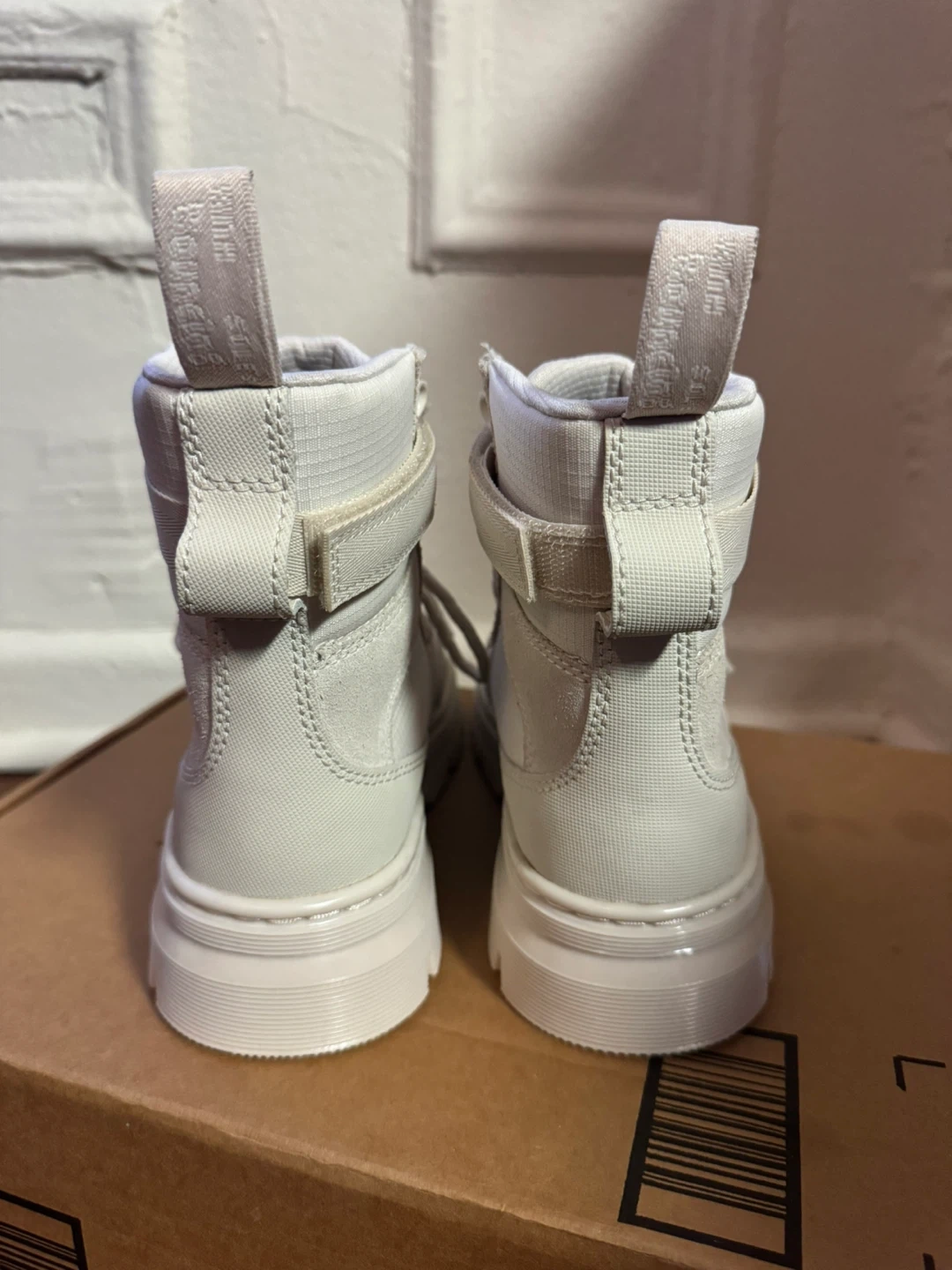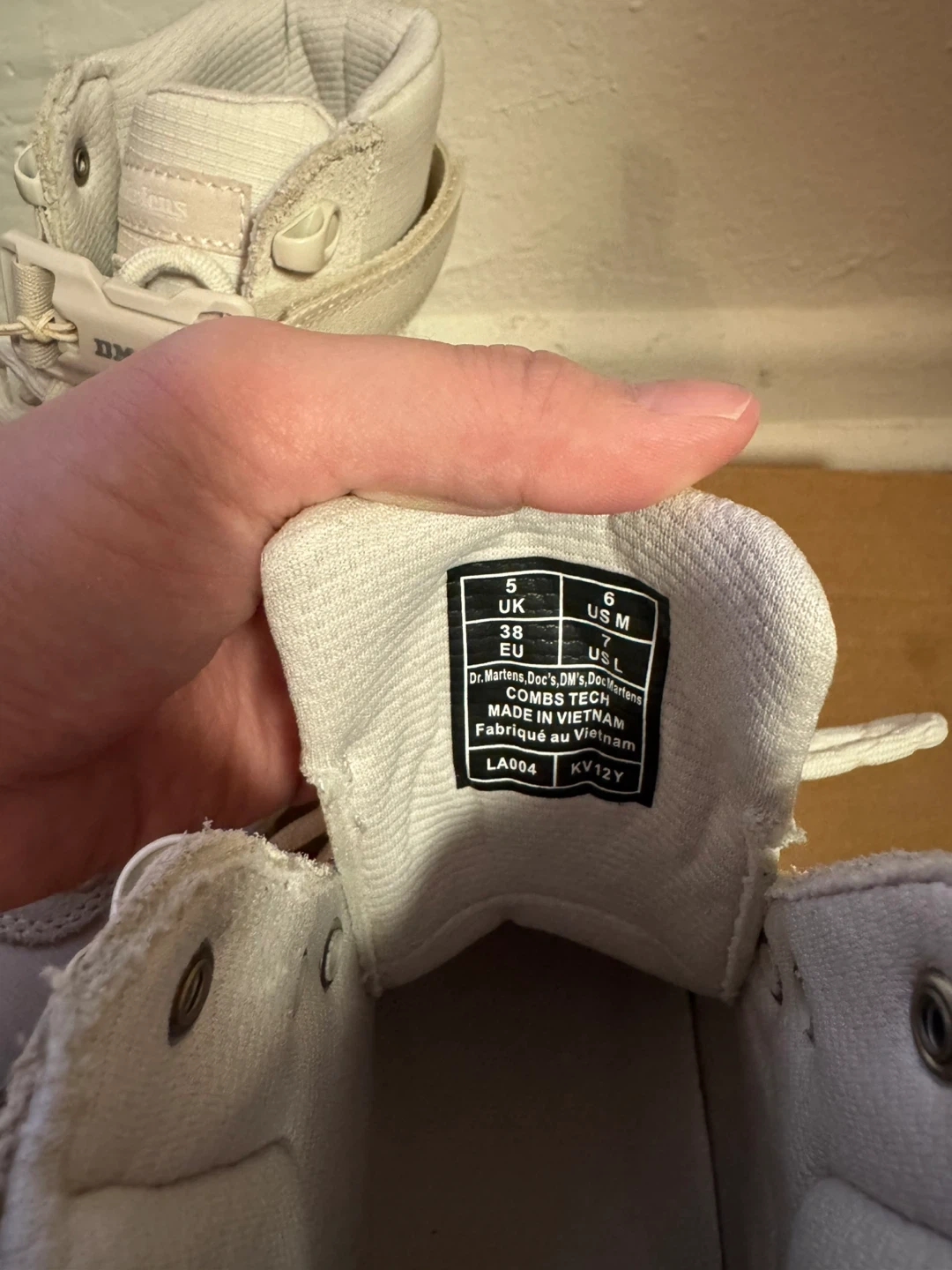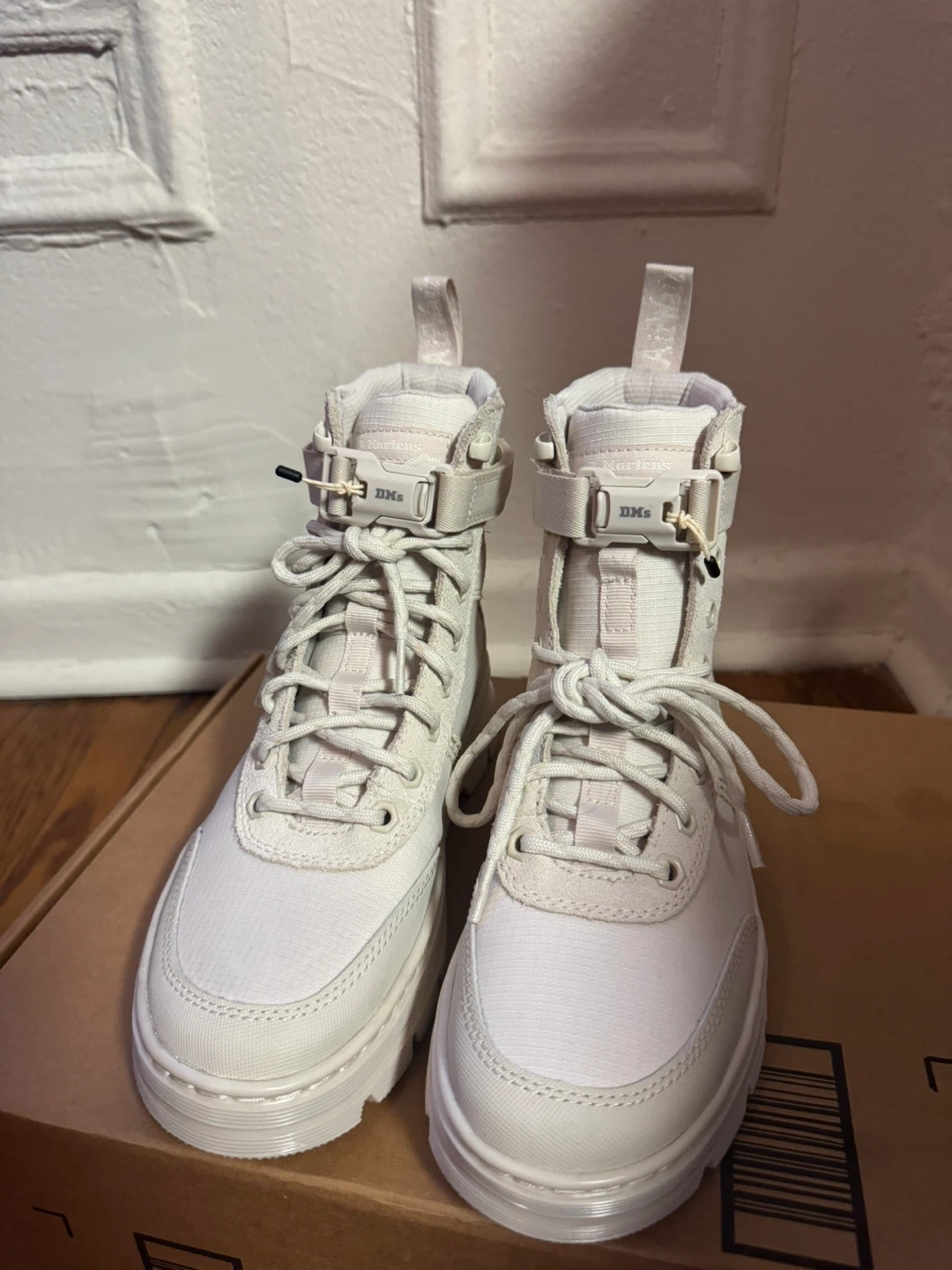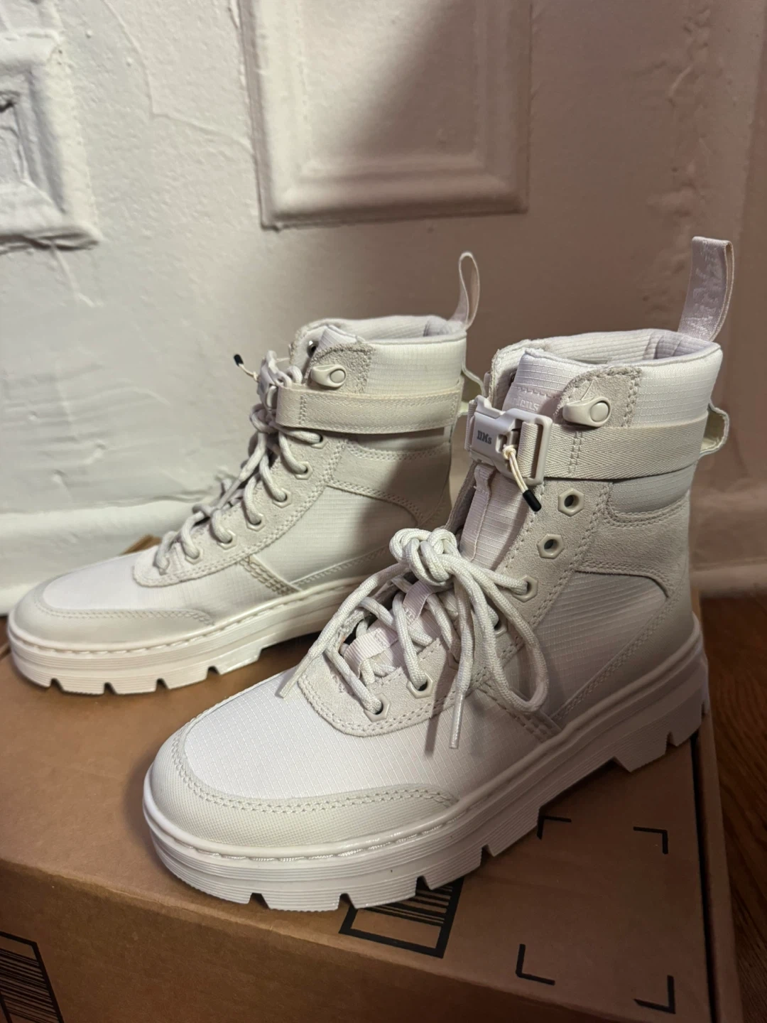 Dr. Martens Combs Tech boots in a cream color. Perfect for the warmer weathers and festivals etc. Only selling because it’s too big for me. Size/tag says women’s 7, but feels like it’s women’s 8.