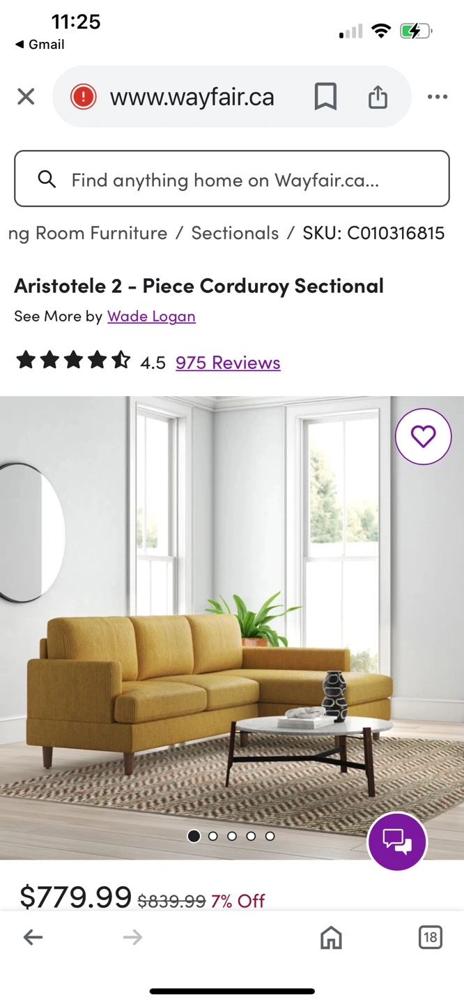 Two-piece sectional sofa with a mustard yellow corduroy fabric. Includes both a chaise lounge and a sofa. New in boxes. Never opened. Open to serious offers.