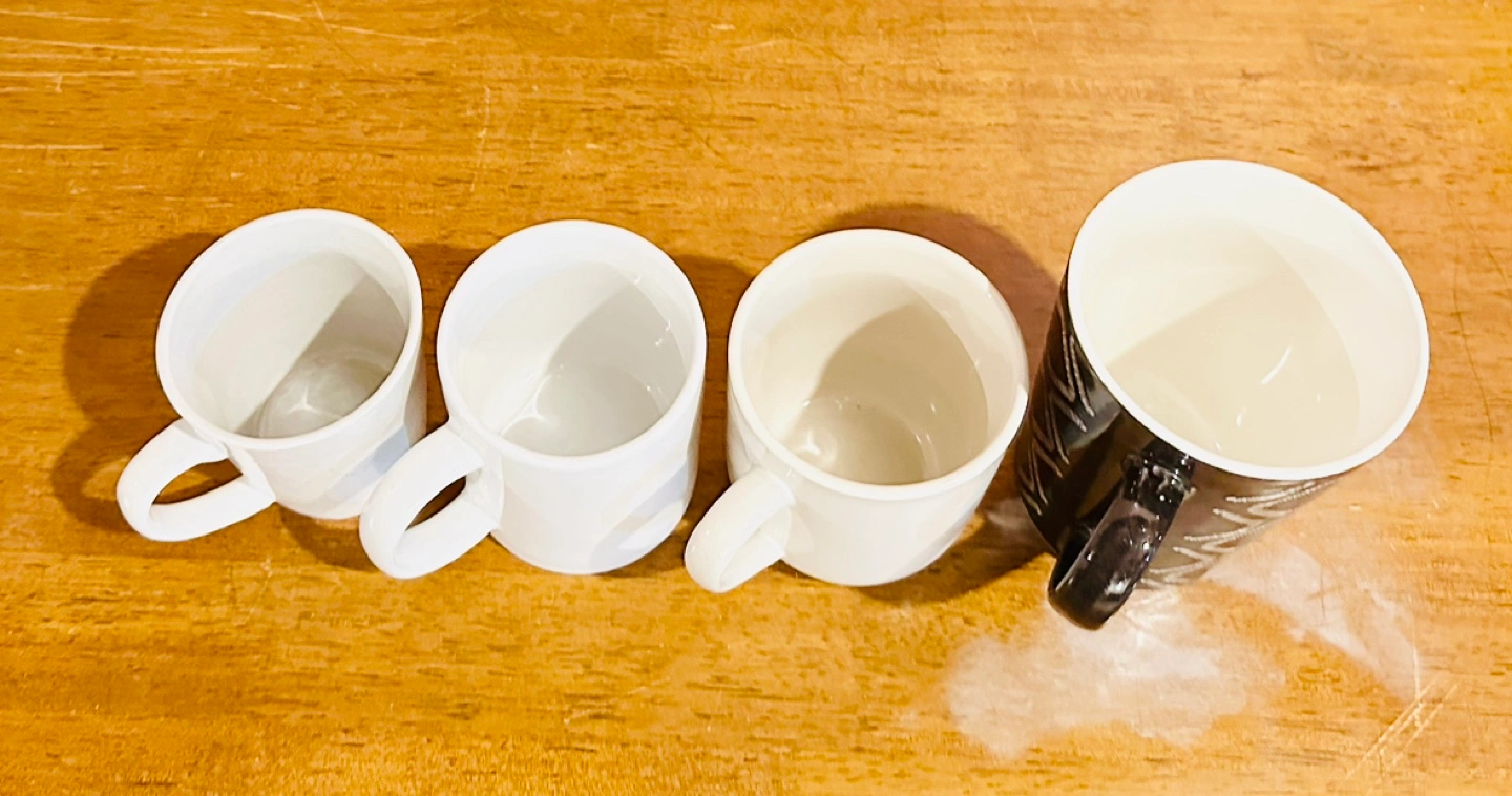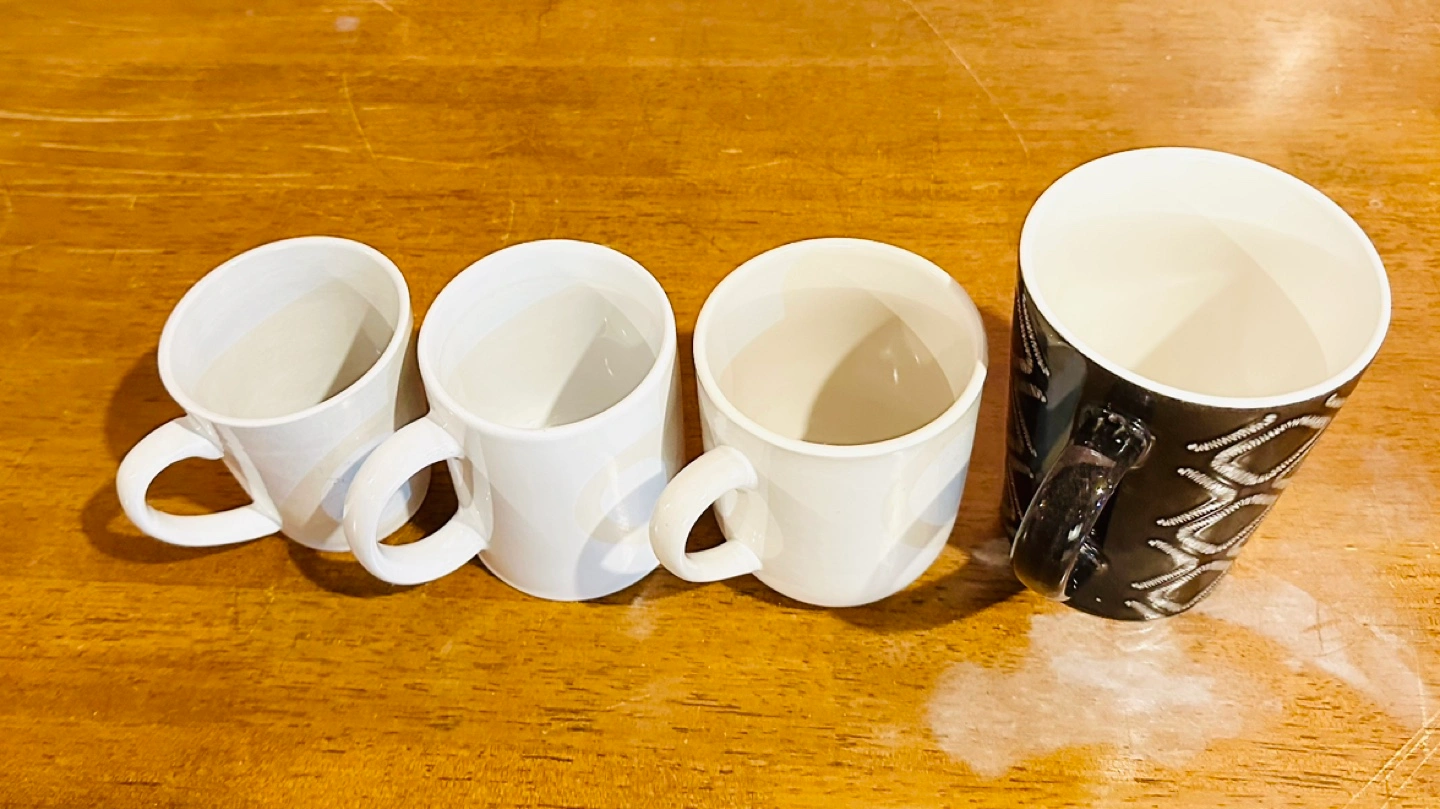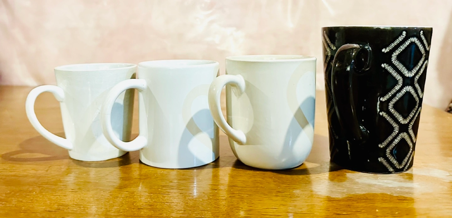 Set of 4 mugs, 3 white with a subtle pattern, 1 black with a geometric pattern. Just brought it in June 2024. Moving out of country so selling it cheap.