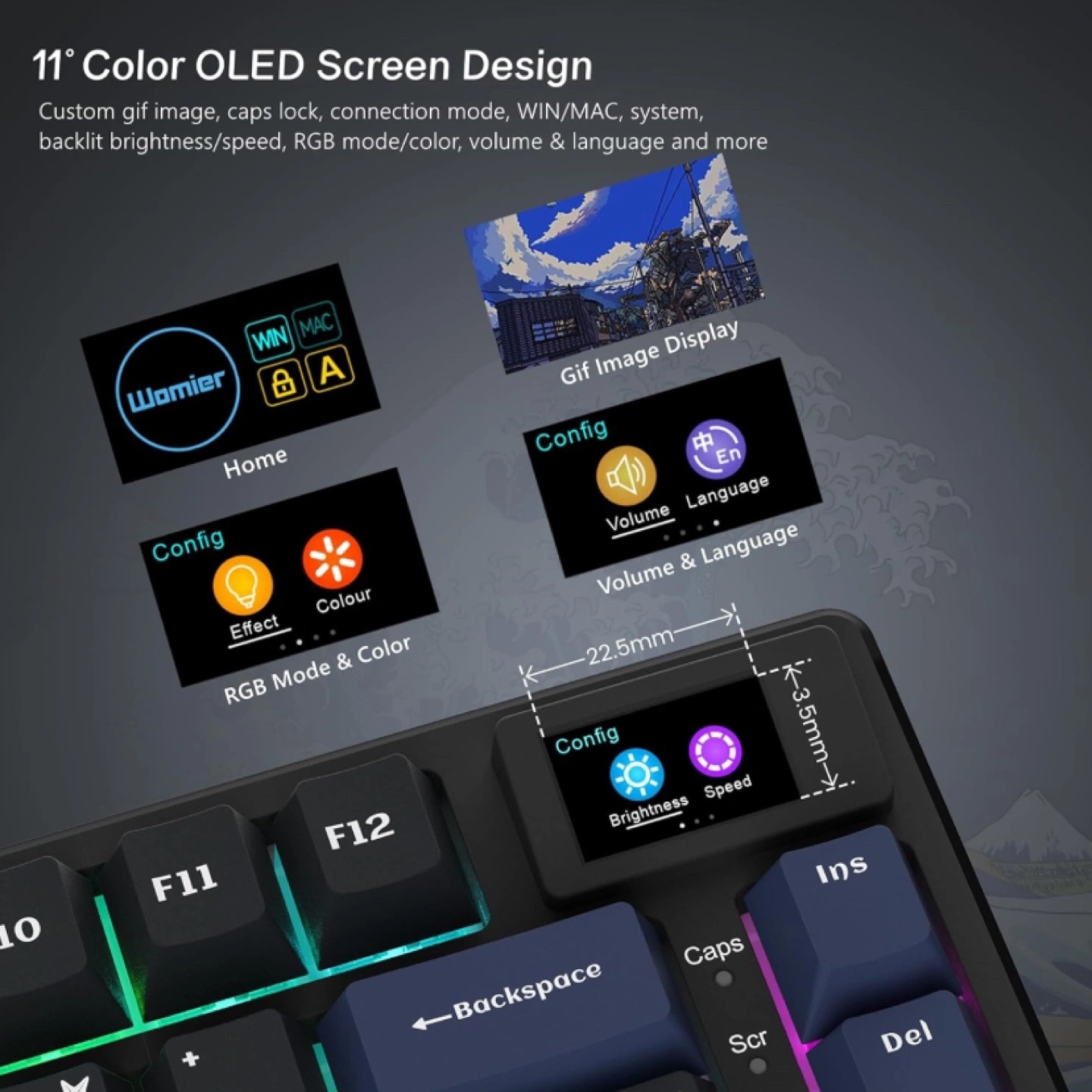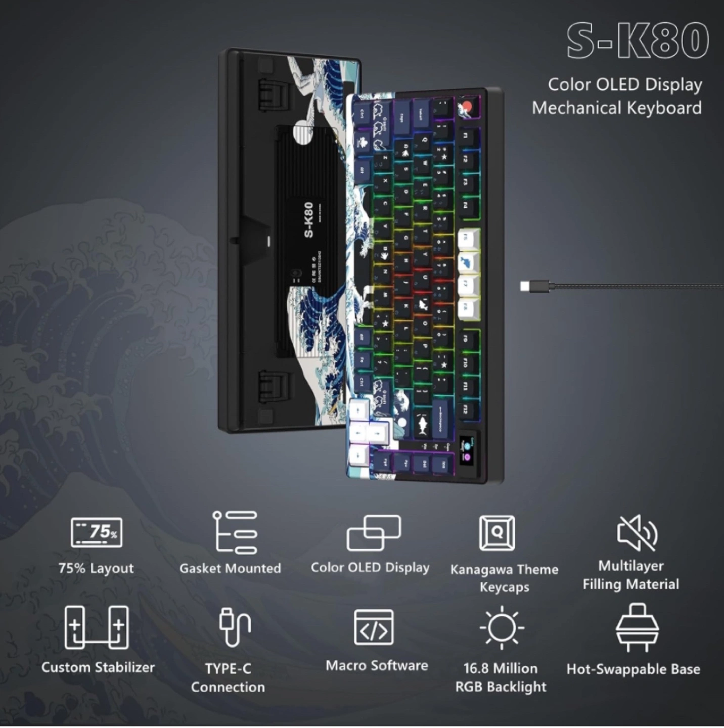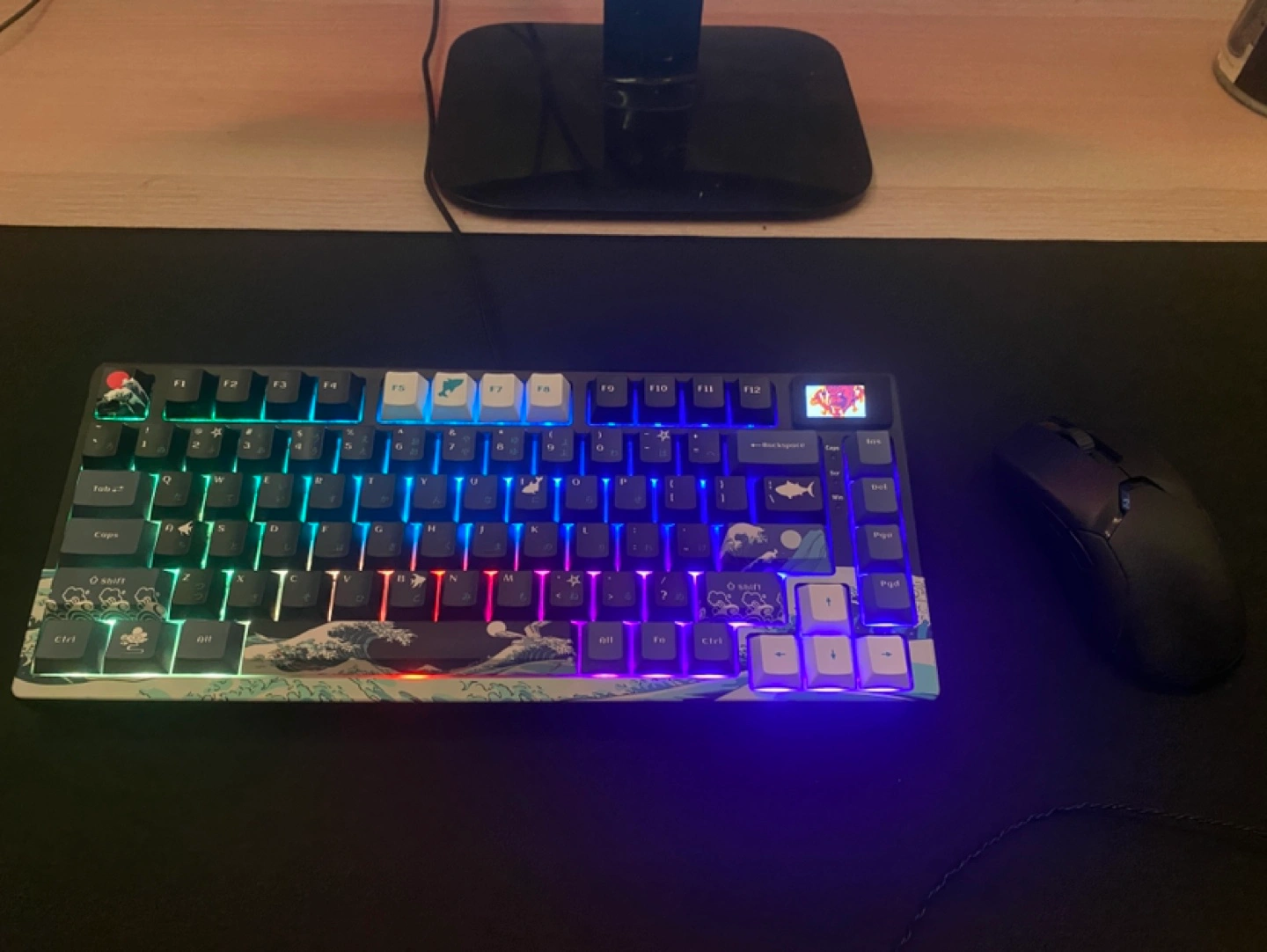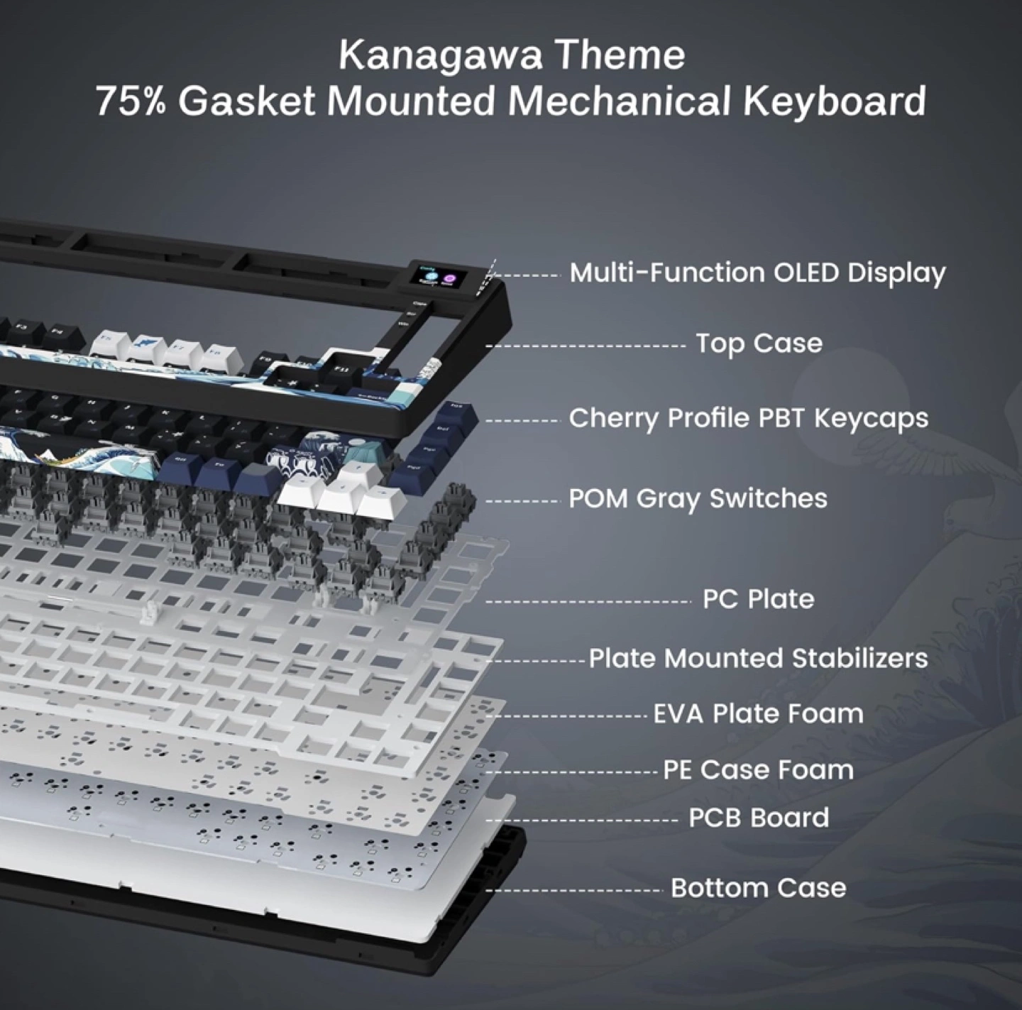 4175% Keyboard, with 5 pin/3 pin black switches. With an LCD Display on the top right with any gif. Kanagawa Keycaps.